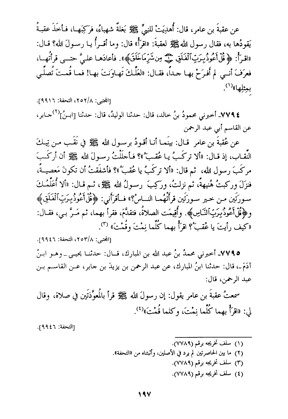 7794 - أَخْبَرَنِي مَحْمُودُ بْنُ خَالِدٍ، قَالَ: حَدَّثَنَا الْوَلِيدُ، قَالَ: حَدَّثَنَا ابْنُ جَابِرٍ، عَنِ الْقَاسِمِ أَبِي عَبْدِ الرَّحْمَنِ، عَنْ عُقْبَةَ بْنِ عَامِرٍ، قَالَ: بَيْنَمَا أَنَا أَقُودُ بِرَسُولِ اللهِ صَلَّى اللهُ عَلَيْهِ وَسَلَّمَ فِي نَقَبٍ مِنْ تِيكَ النِّقَابِ إِذْ قَالَ: «أَلَا تَرْكَبُ يَا عُقْبُ؟» فَأَجْلَلْتُ رَسُولَ اللهِ صَلَّى اللهُ عَلَيْهِ وَسَلَّمَ أَنْ أَرْكَبَ مَرْكَبَ رَسُولِ اللهِ، ثُمَّ قَالَ: «أَلَا تَرْكَبُ يَا عُقْبُ؟» فَأَشْفَقْتُ أَنْ تَكُونَ مَعْصِيَةً فَنَزَلَ وَرَكِبْتُ هُنَيْهَةً، ثُمَّ نَزَلَتْ وَرَكِبَ رَسُولُ اللهِ صَلَّى اللهُ عَلَيْهِ وَسَلَّمَ، ثُمَّ قَالَ: «§أَلَا أُعَلِّمُكَ سُورَتَيْنِ مِنْ خَيْرِ سُورَتَيْنِ قَرَأَتْهُمَا النَّاسُ؟» فَأَقْرَأَنِي قُلْ أَعُوذُ بِرَبِّ الْفَلَقِ، وَقُلْ أَعُوذُ بِرَبِّ النَّاسِ وَأُقِيمَتِ الصَّلَاةُ فَتَقَدَّمَ فَقَرَأَ بِهِمَا ثُمَّ مَرَّ بِي، فَقَالَ: «كَيْفَ رَأَيْتَ يَا عُقْبُ؟ اقْرَأْ بِهِمَا كُلَّمَا نِمْتَ وَقُمْتَ»