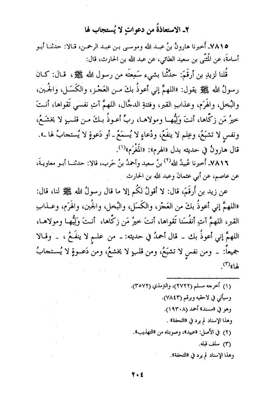 7815 - أَخْبَرَنَا هَارُونُ بْنُ عَبْدِ اللهِ، وَمُوسَى بْنُ عَبْدِ الرَّحْمَنِ، قَالَا: حَدَّثَنَا أَبُو أُسَامَةَ، عَنِ الْمُثَنَّى بْنِ سَعِيدٍ الطَّائِيِّ، عَنْ عَبْدِ اللهِ بْنِ الْحَارِثِ، قَالَ: قُلْنَا لِزَيْدِ بْنِ أَرْقَمَ: حَدِّثْنَا بِشَيْءٍ سَمِعْتَهُ مِنْ رَسُولِ اللهِ صَلَّى اللهُ عَلَيْهِ وَسَلَّمَ قَالَ: كَانَ رَسُولُ اللهِ صَلَّى اللهُ عَلَيْهِ وَسَلَّمَ يَقُولُ: «§اللهُمَّ إِنِّي أَعُوذُ بِكَ مِنَ الْعَجْزِ وَالْكَسَلِ وَالْجُبْنِ وَالْبُخْلِ وَالْهَرَمِ وَعَذَابِ الْقَبْرِ، وَفِتْنَةِ الدَّجَّالِ، اللهُمَّ آتِ نَفْسِي تَقْوَاهَا أَنْتَ خَيْرُ مَنْ زَكَّاهَا أَنْتَ وَلِيِّهَا وَمَوْلَاهَا، رَبِّ أَعُوذُ بِكَ مِنْ قَلْبٍ لَا يَخْشَعُ، وَنَفْسٍ لَا تَشْبَعُ، وَعِلْمٍ لَا يَنْفَعُ، وَدُعَاءٍ لَا يُسْمَعُ، أَوْ دَعْوَةٍ لَا يُسْتَجَابُ لَهَا» قَالَ هَارُونُ: فِي حَدِيثِهِ بَدَلَ الْهَرَمِ، الْمَغْرَمَ
