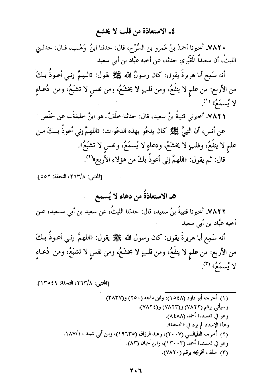 7822 - أَخْبَرَنَا قُتَيْبَةُ بْنُ سَعِيدٍ، قَالَ: حَدَّثَنَا اللَّيْثُ، عَنْ سَعِيدِ بْنِ أَبِي سَعِيدٍ، عَنْ أَخِيهِ عَبَّادِ بْنِ أَبِي سَعِيدٍ، أَنَّهُ سَمِعَ أَبَا هُرَيْرَةَ، يَقُولُ: كَانَ رَسُولُ اللهِ صَلَّى اللهُ عَلَيْهِ وَسَلَّمَ يَقُولُ: " §اللهُمَّ إِنِّي أَعُوذُ بِكَ مِنَ الْأَرْبَعِ: مِنْ عِلْمٍ لَا يَنْفَعُ، وَمِنْ قَلْبٍ لَا يَخْشَعُ، وَمِنْ نَفْسٍ لَا تَشْبَعُ، وَمِنْ دُعَاءٍ لَا يُسْمَعُ "