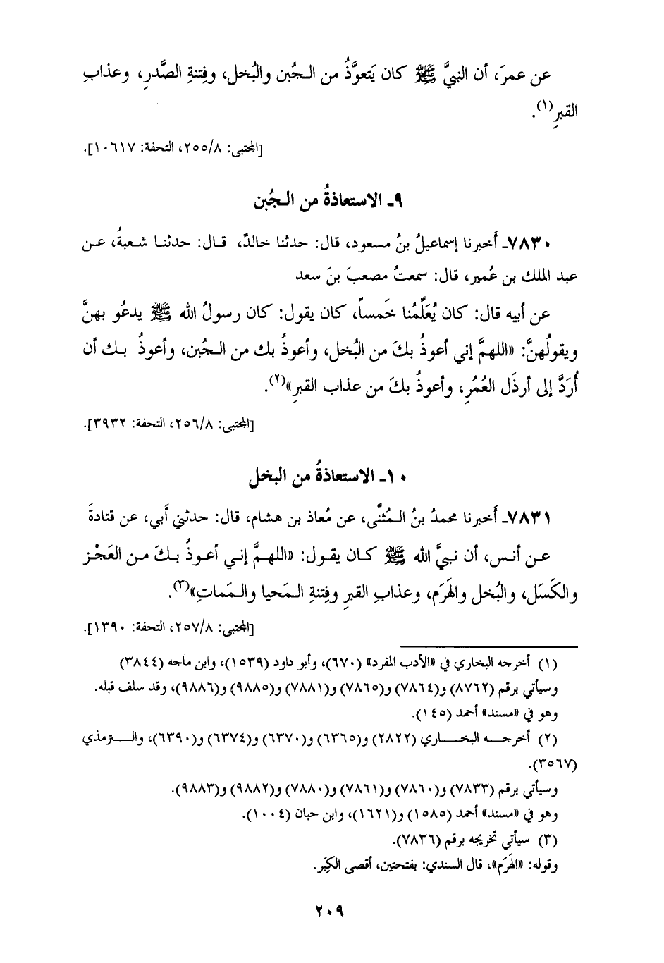 7830 - أَخْبَرَنَا إِسْمَاعِيلُ بْنُ مَسْعُودٍ، قَالَ: حَدَّثَنَا خَالِدٌ، قَالَ: حَدَّثَنَا شُعْبَةُ، عَنْ عَبْدِ الْمَلِكِ بْنِ عُمَيْرٍ، قَالَ: سَمِعْتُ مُصْعَبَ بْنَ سَعْدٍ، عَنْ أَبِيهِ، قَالَ: كَانَ يُعَلِّمُنَا خَمْسًا كَانَ يَقُولُ: كَانَ رَسُولُ اللهِ صَلَّى اللهُ عَلَيْهِ وَسَلَّمَ يَدْعُو بِهِنَّ وَيَقُولُهُنَّ: «§اللهُمَّ إِنِّي أَعُوذُ بِكَ مِنَ الْبُخْلِ، وَأَعُوذُ بِكَ مِنَ الْجُبْنِ، وَأَعُوذُ بِكَ أَنْ أُرَدَّ إِلَى أَرْذَلِ الْعُمُرِ، وَأَعُوذُ بِكَ مِنْ عَذَابِ الْقَبْرِ»