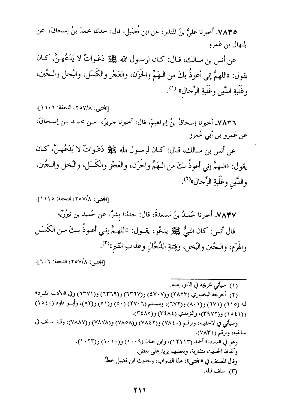 7837 - أَخْبَرَنَا حُمَيْدُ بْنُ مَسْعَدَةَ، قَالَ: حَدَّثَنَا بِشْرٌ، عَنْ حُمَيْدِ بْنِ تَيْرُوَيْهِ، قَالَ أَنَسٌ: كَانَ النَّبِيُّ صَلَّى اللهُ عَلَيْهِ وَسَلَّمَ يَدْعُو يَقُولُ: «§اللهُمَّ إِنِّي أَعُوذُ بِكَ مِنَ الْكَسَلِ وَالْهَرَمِ وَالْجُبْنِ وَالْبُخْلِ وَفِتْنَةِ الدَّجَّالِ، وَعَذَابِ الْقَبْرِ»