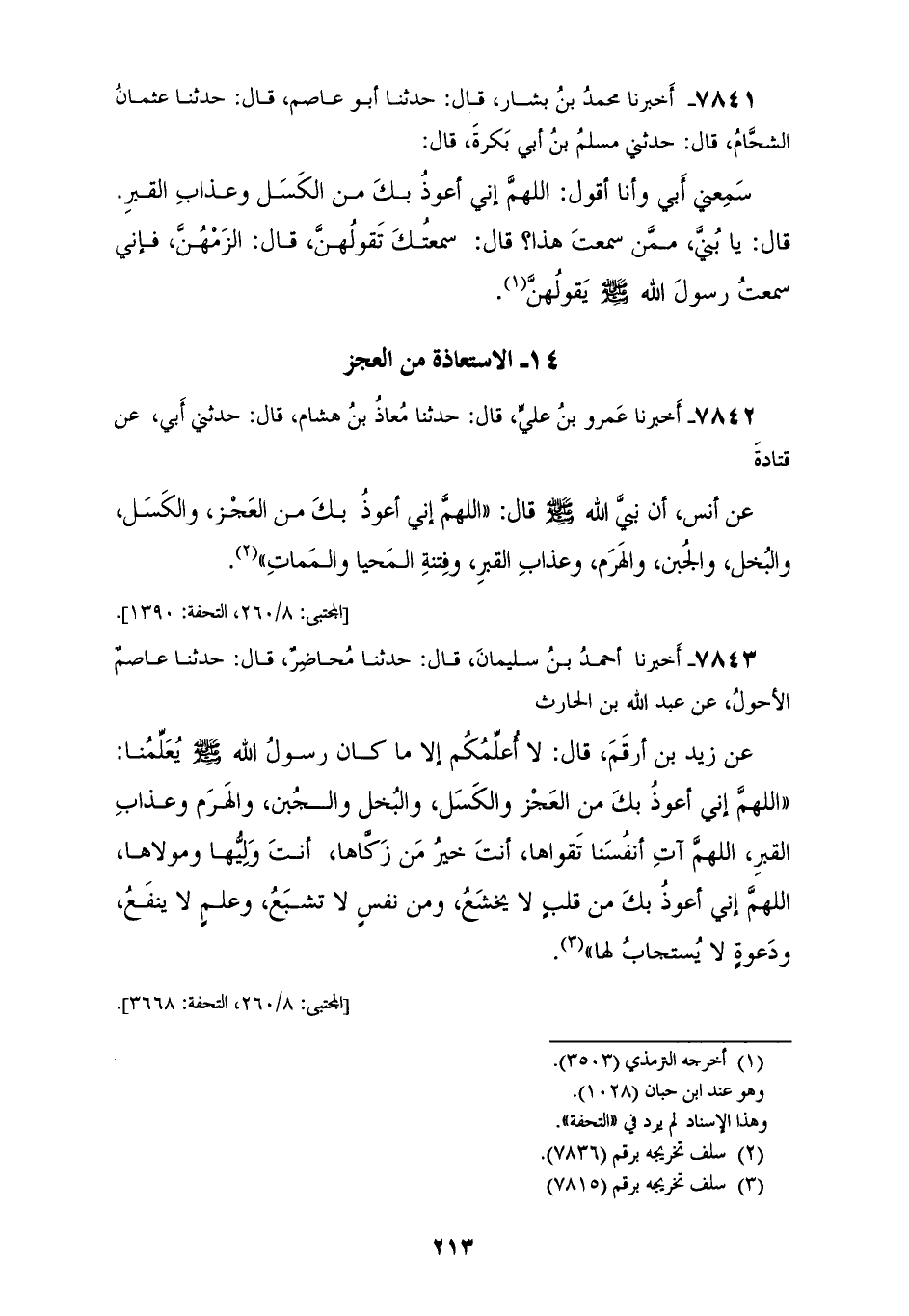 7842 - أَخْبَرَنَا عَمْرُو بْنُ عَلِيٍّ، قَالَ: حَدَّثَنَا مُعَاذُ بْنُ هِشَامٍ، قَالَ: حَدَّثَنِي أَبِي، عَنْ قَتَادَةَ، عَنْ أَنَسٍ، أَنَّ نَبِيَّ اللهِ صَلَّى اللهُ عَلَيْهِ وَسَلَّمَ قَالَ: «§اللهُمَّ إِنِّي أَعُوذُ بِكَ مِنَ الْعَجْزِ وَالْكَسَلِ، وَالْبُخْلِ وَالْجُبْنِ، وَالْهَرَمِ، وَعَذَابِ الْقَبْرِ، وَفِتْنَةِ الْمَحْيَا وَالْمَمَاتِ»
