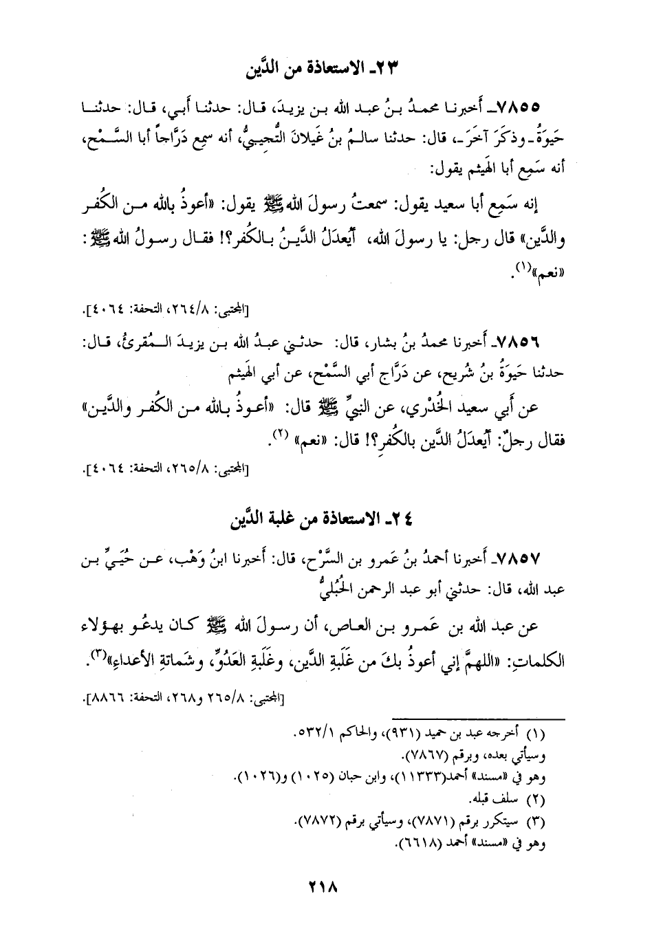 7857 - أَخْبَرَنَا أَحْمَدُ بْنُ عَمْرِو بْنِ السَّرْحِ، قَالَ: أَخْبَرَنَا ابْنُ وَهْبٍ، عَنْ حُيَيِّ بْنِ عَبْدِ اللهِ، قَالَ: حَدَّثَنِي أَبُو عَبْدِ الرَّحْمَنِ الْحُبُلِيُّ، عَنْ عَبْدِ اللهِ بْنِ عَمْرِو بْنِ الْعَاصِ، أَنَّ رَسُولَ اللهِ صَلَّى اللهُ عَلَيْهِ وَسَلَّمَ كَانَ يَدْعُو بِهَؤُلَاءِ الْكَلِمَاتِ «§اللهُمَّ إِنِّي أَعُوذُ بِكَ مِنْ غَلَبَةِ الدَّيْنِ وَغَلَبَةِ الْعَدُوِّ وَشَمَاتَةِ الْأَعْدَاءِ»