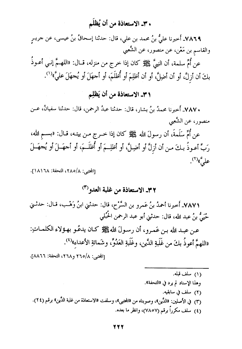 7871 - أَخْبَرَنَا أَحْمَدُ بْنُ عَمْرِو بْنِ السَّرْحِ، قَالَ: حَدَّثَنِي ابْنُ وَهْبٍ، قَالَ: حَدَّثَنِي حُيَيُّ بْنُ عَبْدِ اللهِ، قَالَ: حَدَّثَنِي أَبُو عَبْدِ الرَّحْمَنِ الْحُبُلِيُّ، عَنْ عَبْدِ اللهِ بْنِ عَمْرٍو، أَنَّ رَسُولَ اللهِ صَلَّى اللهُ عَلَيْهِ وَسَلَّمَ كَانَ يَدْعُو بِهَؤُلَاءِ الْكَلِمَاتِ «§اللهُمَّ أَعُوذُ بِكَ مِنْ غَلَبَةِ الدَّيْنِ، وَغَلَبَةِ الْعَدُوِّ، وَشَمَاتَةِ الْأَعْدَاءِ»