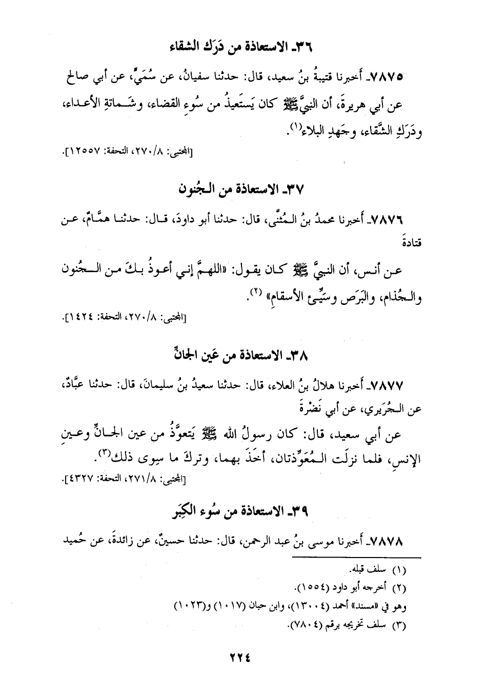 7876 - أَخْبَرَنَا مُحَمَّدُ بْنُ الْمُثَنَّى، قَالَ: حَدَّثَنَا أَبُو دَاوُدَ، قَالَ: حَدَّثَنَا هَمَّامٌ، عَنْ قَتَادَةَ، عَنْ أَنَسٍ، أَنَّ النَّبِيَّ صَلَّى اللهُ عَلَيْهِ وَسَلَّمَ كَانَ يَقُولُ: «§اللهُمَّ إِنِّي أَعُوذُ بِكَ مِنَ الْجُنُونِ، وَالْجُذَامِ، وَالْبَرَصِ، وَسَيَّئِ الْأَسْقَامِ»