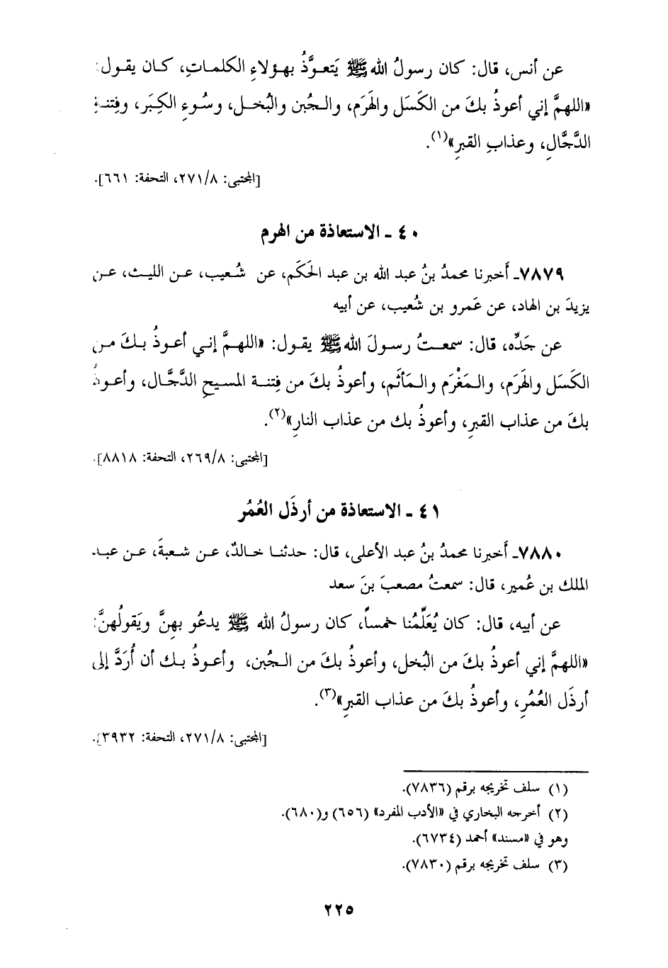 7880 - أَخْبَرَنَا مُحَمَّدُ بْنُ عَبْدِ الْأَعْلَى، قَالَ: حَدَّثَنَا خَالِدٌ، عَنْ شُعْبَةَ، عَنْ عَبْدِ الْمَلِكِ بْنِ عُمَيْرٍ، قَالَ: سَمِعْتُ مُصْعَبَ بْنَ سَعْدٍ، عَنْ أَبِيهِ، قَالَ: كَانَ يُعَلِّمُنَا خَمْسًا كَانَ رَسُولُ اللهِ صَلَّى اللهُ عَلَيْهِ وَسَلَّمَ يَدْعُو بِهِنَّ وَيَقُولُهُنَّ: «§اللهُمَّ إِنِّي أَعُوذُ بِكَ مِنَ الْبُخْلِ، وَأَعُوذُ بِكَ مِنَ الْجُبْنِ، وَأَعُوذُ بِكَ أَنْ أَرُدَّ إِلَى أَرْذَلِ الْعُمُرِ، وَأَعُوذُ بِكْ مِنْ عَذَابِ الْقَبْرِ»