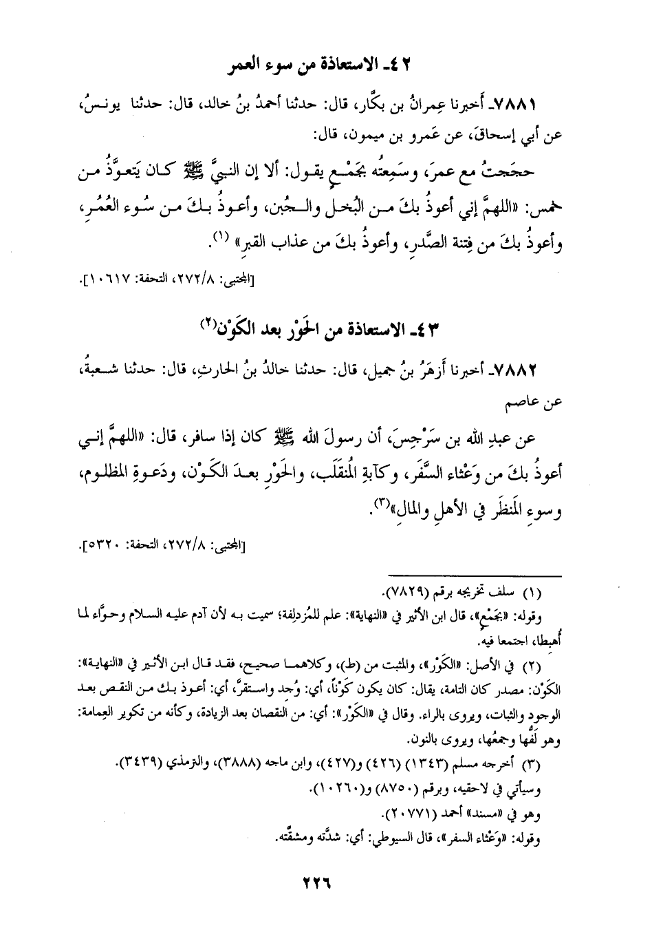7882 - أَخْبَرَنَا أَزْهَرُ بْنُ جَمِيلٍ، قَالَ: حَدَّثَنَا خَالِدُ بْنُ الْحَارِثِ، قَالَ: حَدَّثَنَا شُعْبَةُ، عَنْ عَاصِمٍ، عَنْ عَبْدِ اللهِ بْنِ سَرْجِسَ، أَنَّ رَسُولَ اللهِ صَلَّى اللهُ عَلَيْهِ وَسَلَّمَ كَانَ §إِذَا سَافَرَ، قَالَ: «اللهُمَّ إِنِّي أَعُوذُ بِكَ مِنْ وَعْثَاءِ السَّفَرِ، وَكَآبَةِ الْمُنْقَلَبِ، وَالْحَوْرِ بَعْدَ الْكَوْنِ، وَدَعْوَةِ الْمَظْلُومِ، وَسُوءِ الْمَنْظَرِ فِي الْأَهْلِ وَالْمَالِ»