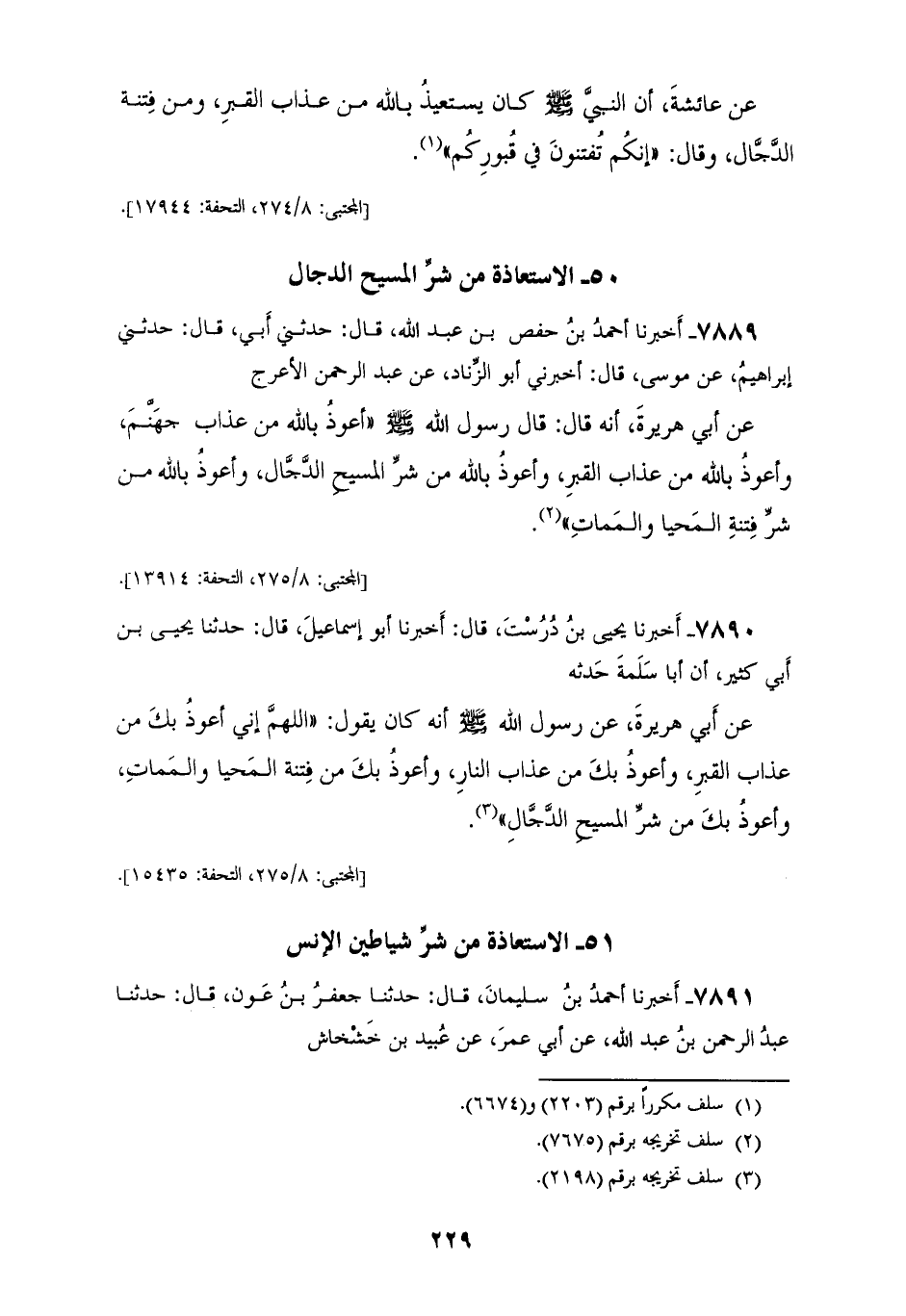 7888 - أَخْبَرَنَا قُتَيْبَةُ بْنُ سَعِيدٍ، قَالَ: حَدَّثَنَا سُفْيَانُ، عَنْ يُحْيِي، عَنْ عَمْرَةَ، عَنْ عَائِشَةَ، أَنَّ النَّبِيَّ صَلَّى اللهُ عَلَيْهِ وَسَلَّمَ كَانَ يَسْتَعِيذُ بِاللهِ مِنْ عَذَابِ الْقَبْرِ وَمِنْ فِتْنَةِ الدَّجَّالِ وَقَالَ:: «§إِنَّكُمْ تُفْتَنُونَ فِي قُبُورِكُمْ»