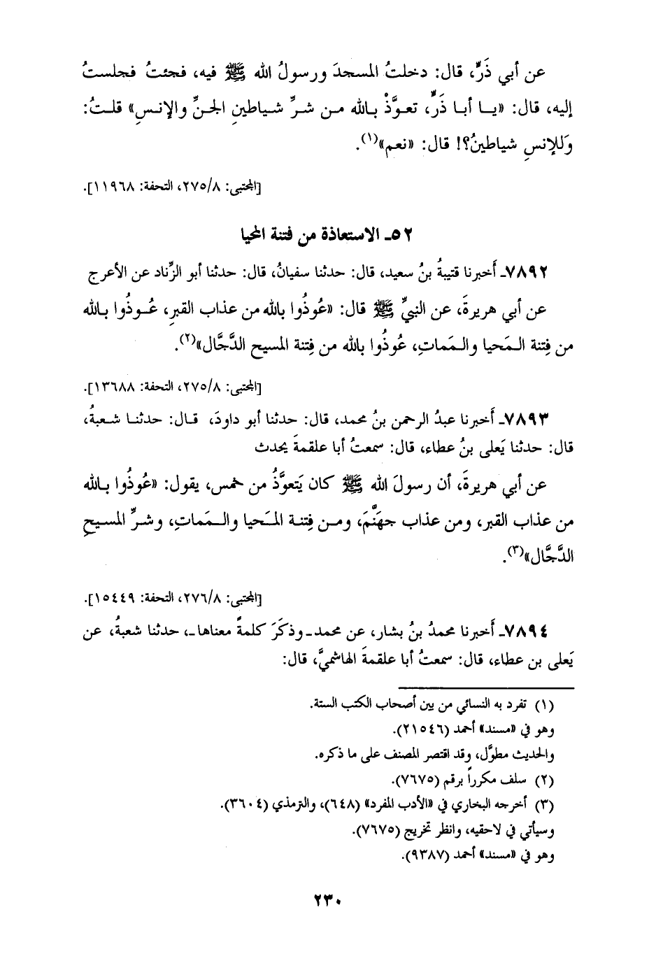 7892 - أَخْبَرَنَا قُتَيْبَةُ بْنُ سَعِيدٍ، قَالَ: حَدَّثَنَا سُفْيَانُ، قَالَ: حَدَّثَنَا أَبُو الزِّنَادِ، عَنِ الْأَعْرَجِ، عَنْ أَبِي هُرَيْرَةَ، عَنِ النَّبِيِّ صَلَّى اللهُ عَلَيْهِ وَسَلَّمَ قَالَ: «§عُوذُوا بِاللهِ مِنْ عَذَابِ الْقَبْرِ عُوذُوا بِاللهِ مِنْ فِتْنَةِ الْمَحْيَا وَالْمَمَاتِ، عُوذُوا بِاللهِ مِنْ فِتْنَةِ الْمَسِيحِ الدَّجَّالِ»