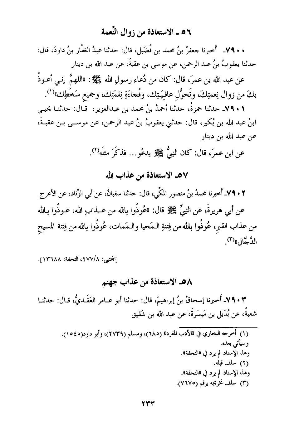 7900 - أَخْبَرَنَا جَعْفَرُ بْنُ مُحَمَّدِ بْنِ فُضَيْلٍ، قَالَ: حَدَّثَنَا عَبْدُ الْغَفَّارِ بْنُ دَاوُدَ، قَالَ: حَدَّثَنَا يَعْقُوبُ بْنُ عَبْدِ الرَّحْمَنِ، عَنْ مُوسَى بْنِ عُقْبَةَ، عَنْ عَبْدِ اللهِ بْنِ دِينَارٍ، عَنْ عَبْدِ اللهِ بْنِ عُمَرَ، قَالَ: كَانَ مِنْ دُعَاءِ رَسُولِ اللهِ صَلَّى اللهُ عَلَيْهِ وَسَلَّمَ «§اللهُمَّ إِنِّي أَعُوذُ بِكَ مِنْ زَوَالِ نِعْمَتِكَ، وَتَحَوُّلِ عَافِيَتِكَ، وَفُجَاءَةِ نِقْمَتِكَ وَجَمِيعِ سَخَطِكَ»