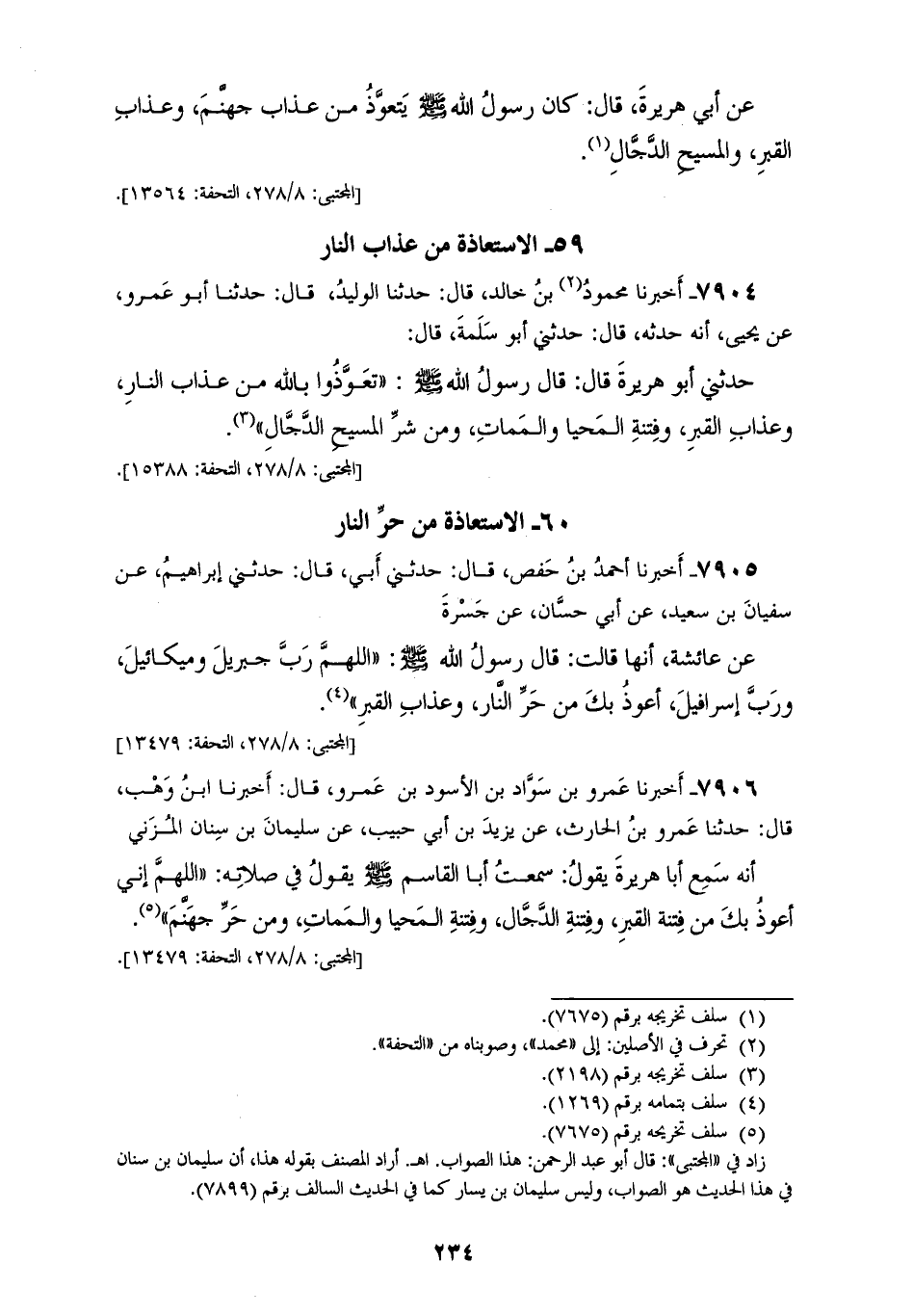 7906 - أَخْبَرَنَا عَمْرُو بْنُ سَوَادِ بْنِ الْأَسْوَدِ بْنِ عَمْرٍو، قَالَ: أَخْبَرَنَا ابْنُ وَهْبٍ، قَالَ: حَدَّثَنَا عَمْرُو بْنُ الْحَارِثِ، عَنْ يَزِيدَ بْنِ أَبِي حَبِيبٍ، عَنْ سُلَيْمَانَ بْنِ سِنَانٍ الْمُزَنِيِّ، أَنَّهُ سَمِعَ أَبَا هُرَيْرَةَ، يَقُولُ: سَمِعْتُ أَبَا الْقَاسِمٍ صَلَّى اللهُ عَلَيْهِ وَسَلَّمَ يَقُولُ فِي صَلَاتِهِ: «§اللهُمَّ إِنِّي أَعُوذُ بِكَ مِنْ فِتْنَةِ الْقَبْرِ، وَفِتْنَةِ الدَّجَّالِ، وَفِتْنَةِ الْمَحْيَا وَالْمَمَاتِ، وَمِنْ حَرِّ جَهَنَّمَ»
