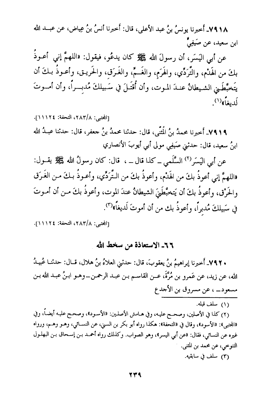 7918 - أَخْبَرَنَا يُونُسُ بْنُ عَبْدِ الْأَعْلَى، قَالَ: أَخْبَرَنَا أَنَسُ بْنُ عِيَاضٍ، عَنْ عَبْدِ اللهِ بْنِ سَعِيدٍ، عَنْ صَيْفِيٍّ، عَنْ أَبِي الْيُسْرِ، أَنَّ رَسُولَ اللهِ صَلَّى اللهُ عَلَيْهِ وَسَلَّمَ كَانَ يَدْعُو فَيَقُولُ: «§اللهُمَّ إِنِّي أَعُوذُ بِكَ مِنَ الْهَدْمِ وَالتَّرَدِّي وَالْهَرَمِ وَالْغَمِّ وَالْغَرِقِ وَالْحَرِيقِ، وَأَعُوذُ بِكَ أَنْ يَتَخَبَّطَنِي الشَّيْطَانُ عِنْدَ الْمَوْتِ، وَأَنْ أُقْتَلَ فِي سَبِيلِكَ مُدْبِرًا، وَأَنْ أَمُوتَ لَدِيغًا»