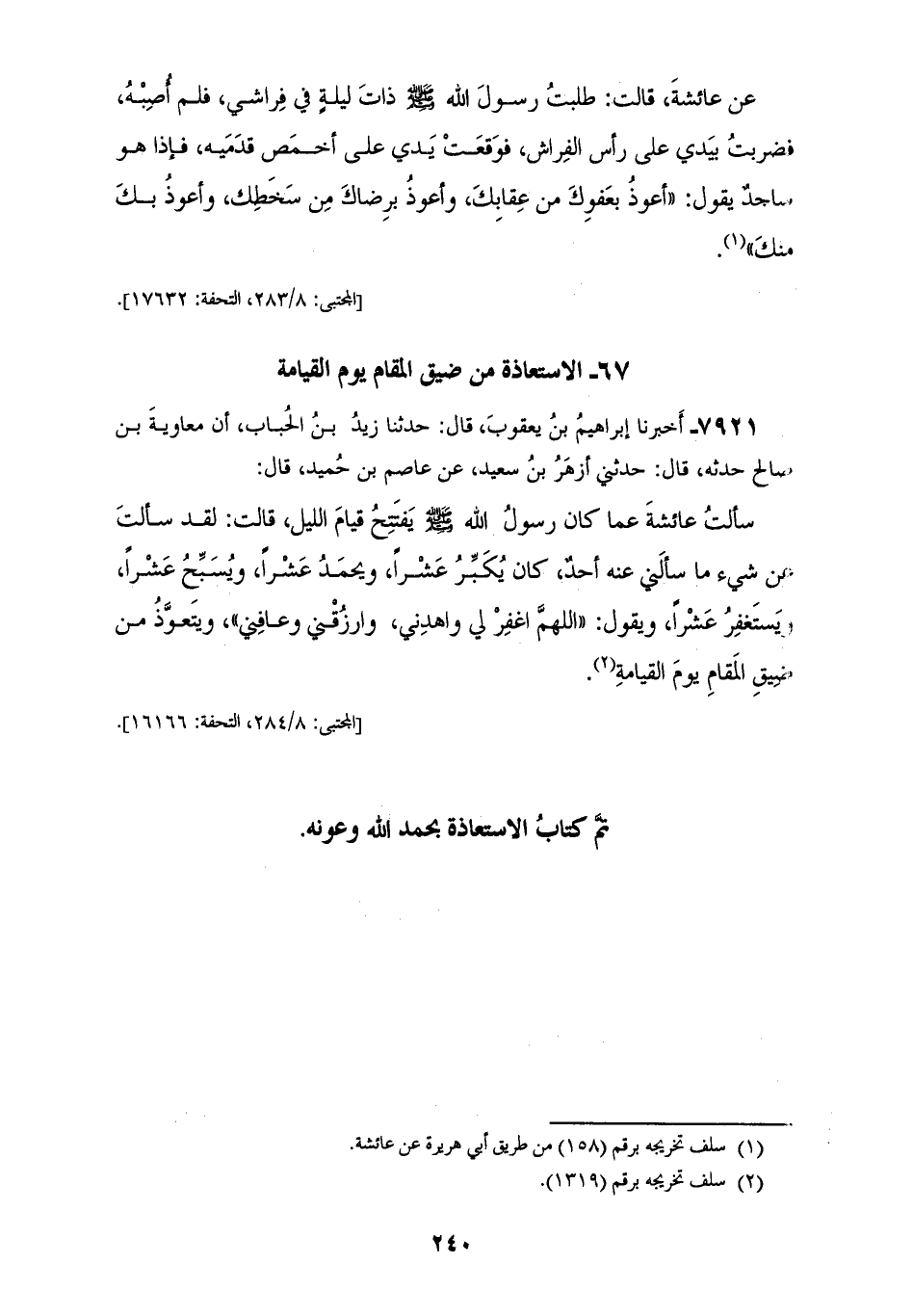 7920 - أَخْبَرَنَا إِبْرَاهِيمُ بْنُ يَعْقُوبَ، قَالَ: حَدَّثَنِي الْعَلَاءُ بْنُ هِلَالٍ، قَالَ: حَدَّثَنَا عُبَيْدُ اللهِ، عَنْ زَيْدٍ، عَنْ عَمْرِو بْنِ مُرَّةَ، عَنِ الْقَاسِمِ بْنِ عَبْدِ الرَّحْمَنِ - وَهُوَ ابْنُ عَبْدِ اللهِ بْنِ مَسْعُودٍ، عَنْ مَسْرُوقِ بْنِ الْأَجْدَعِ، عَنْ عَائِشَةَ، قَالَتْ: طَلَبْتُ رَسُولَ اللهِ صَلَّى اللهُ عَلَيْهِ وَسَلَّمَ ذَاتَ لَيْلَةٍ فِي فِرَاشِي فَلَمْ أُصِبْهُ فَضَرَبْتُ بِيَدِي عَلَى رَأْسِ الْفِرَاشِ فَوَقَعَتْ يَدِي عَلَى أُخْمُصِ قَدَمَيْهِ، فَإِذَا هُوَ سَاجِدٌ يَقُولُ: «§أَعُوذُ بِعَفْوِكَ مِنْ عِقَابِكَ، وَأَعُوذُ بِرِضَاكَ مِنْ سَخَطِكَ، وَأَعُوذُ بِكَ مِنْكَ»