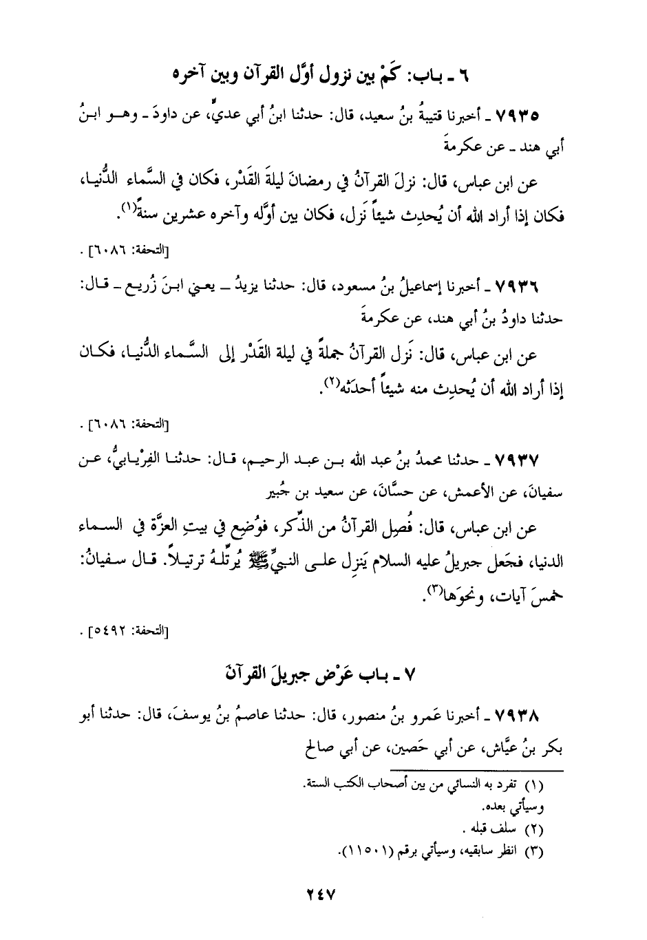 7935 - أَخْبَرَنَا قُتَيْبَةُ بْنُ سَعِيدٍ قَالَ: حَدَّثَنَا ابْنُ أَبِي عَدِيٍّ، عَنْ دَاوُدَ وَهُوَ ابْنُ أَبِي هِنْدَ، عَنْ عِكْرِمَةَ، عَنِ ابْنِ عَبَّاسٍ قَالَ: «§نَزَلَ الْقُرْآنُ فِي رَمَضَانَ لَيْلَةَ الْقَدْرِ فَكَانَ فِي السَّمَاءِ الدُّنْيَا فَكَانَ إِذَا أَرَادَ اللهُ أَنْ يُحْدِثَ شَيْئًا نَزَّلَ فَكَانَ بَيْنَ أَوَّلِهِ وَآخِرِهِ عِشْرِينَ سَنَةً»