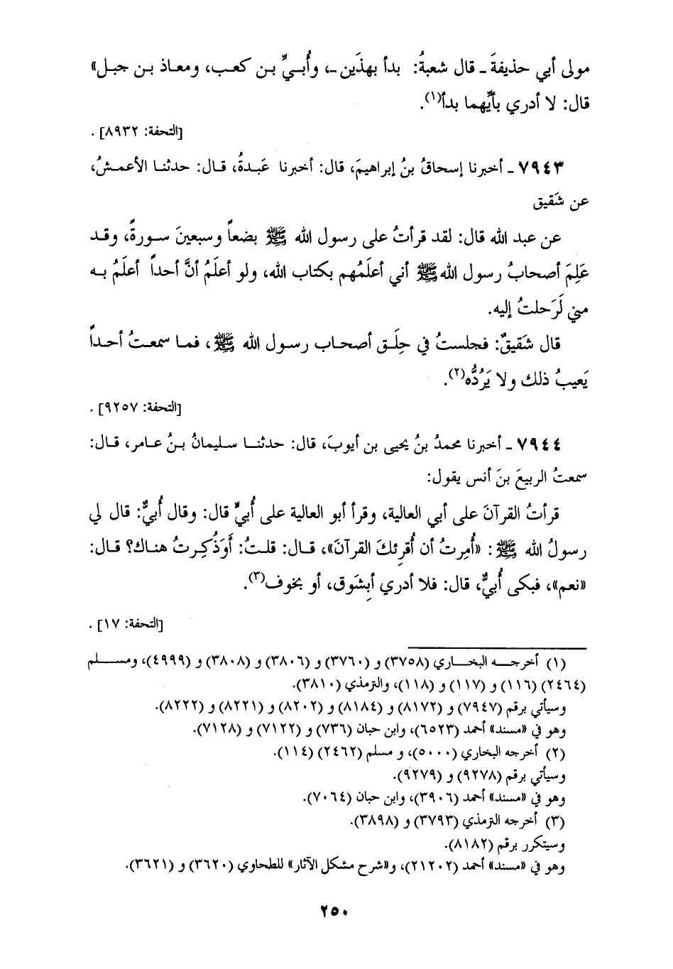 7943 - أَخْبَرَنَا إِسْحَاقُ بْنُ إِبْرَاهِيمَ قَالَ: أَخْبَرَنَا عَبْدَةُ قَالَ: حَدَّثَنَا الْأَعْمَشُ، عَنْ شَقِيقٍ، عَنْ عَبْدِ اللهِ قَالَ: §لَقَدْ قَرَأْتُ عَلَى رَسُولِ اللهِ صَلَّى اللهُ عَلَيْهِ وَسَلَّمَ بِضْعًا وَسَبْعِينَ سُورَةً، وَقَدْ عَلِمَ أَصْحَابُ رَسُولِ اللهِ صَلَّى اللهُ عَلَيْهِ وَسَلَّمَ أَنِّي أَعْلَمُهُمْ بِكِتَابِ اللهِ وَلَوْ أَعْلَمُ أَنَّ أَحَدًا أَعْلَمَ بِهِ مِنِّي لَرَحَلْتُ إِلَيْهِ قَالَ شَقِيقٌ: «فَجَلَسْتُ فِي حِلَقِ أَصْحَابِ رَسُولِ اللهِ صَلَّى اللهُ عَلَيْهِ وَسَلَّمَ، فَمَا سَمِعْتُ أَحَدًا يَعِيبُ ذَلِكَ وَلَا يَرُدَّهُ»