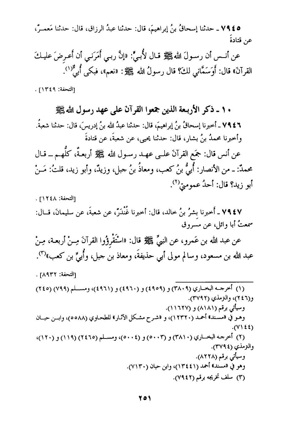 7946 - أَخْبَرَنَا إِسْحَاقُ بْنُ إِبْرَاهِيمَ قَالَ: حَدَّثَنَا عَبْدُ اللهِ بْنُ إِدْرِيسَ قَالَ: حَدَّثَنَا شُعْبَةُ، وَأَخْبَرَنَا مُحَمَّدُ بْنُ بَشَّارٍ قَالَ: حَدَّثَنَا يَحْيَى، عَنْ شُعْبَةَ، عَنْ قَتَادَةَ، عَنْ أَنَسٍ قَالَ: §جَمَعَ الْقُرْآنَ عَلَى عَهْدِ رَسُولِ اللهِ صَلَّى اللهُ عَلَيْهِ وَسَلَّمَ أَرْبَعَةٌ كُلُّهُمْ قَالَ مُحَمَّدٌ " مِنَ الْأَنْصَارِ أُبَيُّ بْنُ كَعْبٍ، وَمُعَاذُ بْنُ جَبَلٍ، وَزِيدٌ، وَأَبُو زَيْدٍ، قُلْتُ: مَنْ أَبُو زَيْدٍ؟ قَالَ: «أَحَدُ عُمُومَتِي»