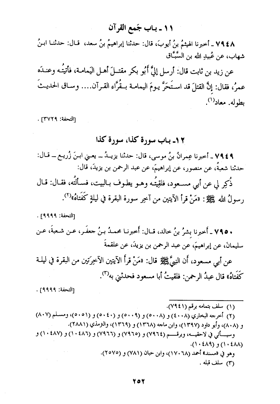 7948 - أَخْبَرَنَا الْهَيْثَمُ بْنُ أَيُّوبَ قَالَ: حَدَّثَنَا إِبْرَاهِيمُ بْنُ سَعْدٍ قَالَ: حَدَّثَنَا ابْنُ شِهَابٍ، عَنْ عُبَيْدِ اللهِ بْنِ السَّبَّاقِ، عَنْ زَيْدِ بْنِ ثَابِتٍ قَالَ: §أَرْسَلَ إِلَيَّ أَبُو بَكْرٍ مَقْتَلَ أَهْلِ الْيَمَامَةِ فَأَتَيْتُهُ وَعِنْدَهُ عُمَرُ فَقَالَ: «إِنَّ الْقَتْلَ قَدِ اسْتَحَرَّ يَوْمَ الْيَمَامَةِ بِقُرَّاءِ الْقُرْآنِ. . . . . وَسَاقَ الْحَدِيثَ بِطُولِهِ» مُعَادٌ