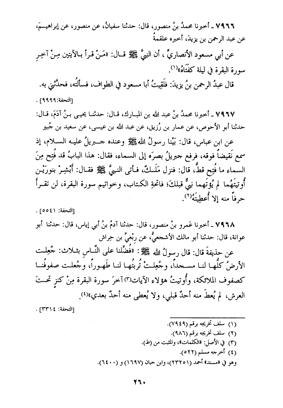 7966 - أَخْبَرَنَا مُحَمَّدُ بْنُ مَنْصُورٍ قَالَ: حَدَّثَنَا سُفْيَانُ، عَنْ مَنْصُورٍ، عَنْ إِبْرَاهِيمَ، عَنْ عَبْدِ الرَّحْمَنِ بْنِ يَزِيدَ، أَخْبَرَهُ عَلْقَمَةُ، عَنْ أَبِي مَسْعُودٍ الْأَنْصَارِيِّ، أَنَّ النَّبِيَّ صَلَّى اللهُ عَلَيْهِ وَسَلَّمَ قَالَ: «§مَنْ قَرَأَ بِالْآيَتَيْنِ مِنْ آخِرِ سُورَةِ الْبَقَرَةِ فِي لَيْلَةٍ كَفَتَاهُ» قَالَ عَبْدُ الرَّحْمَنِ بْنُ يَزِيدَ: فَلَقِيتُ أَبَا مَسْعُودٍ فِي الطَّوَافِ فَسَأَلْتُهُ فَحَدَّثَنِي بِهِ