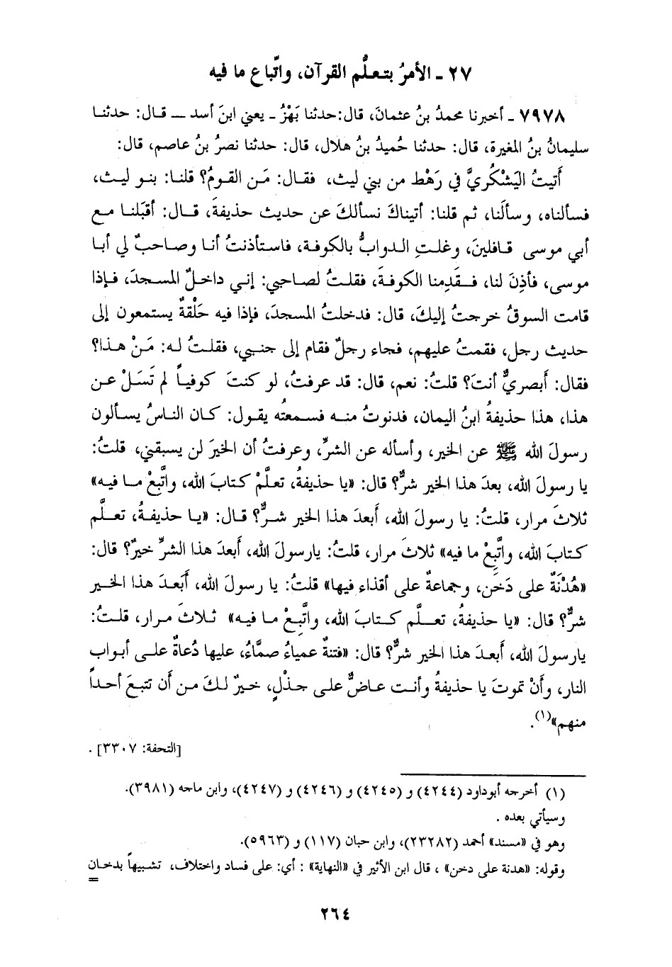 7978 - أَخْبَرَنَا مُحَمَّدُ بْنُ عُثْمَانَ قَالَ: حَدَّثَنَا بَهْزٌ يَعْنِي ابْنَ أَسَدٍ قَالَ: حَدَّثَنَا سُلَيْمَانُ بْنُ الْمُغِيرَةِ قَالَ: حَدَّثَنَا حُمَيْدُ بْنُ هِلَالٍ قَالَ: حَدَّثَنَا نَصْرُ بْنُ عَاصِمٍ قَالَ: §أَتَيْتُ الْيَشْكُرِيَّ فِي رَهْطٍ مِنْ بَنِي لَيْثٍ فَقَالَ: «مَنِ الْقَوْمُ؟» قُلْنَا: بَنُو لَيْثٍ فَسَأَلْنَاهُ وَسَأَلْنَا ثُمَّ قُلْنَا أَتَيْنَاكَ نَسْأَلُكَ عَنْ حَدِيثِ حُذَيْفَةَ قَالَ: «أَقْبَلْنَا مَعَ أَبِي مُوسَى قَافِلِينَ وَغَلَتِ الدَّوَابُّ بِالْكُوفَةِ فَاسْتَأْذَنْتُ أَنَا وَصَاحِبٌ لِي أَبَا مُوسَى فَأَذِنَ لَنَا فَقَدِمْنَا الْكُوفَةَ» فَقُلْتُ لِصَاحِبِي: إِنِّي دَاخِلُ الْمَسْجِدِ فَإِذَا قَامَتِ السُّوقُ خَرَجْتُ إِلَيْكِ قَالَ: «فَدَخَلْتُ الْمَسْجِدَ فَإِذَا فِيهِ حَلْقَةٌ يَسْتَمِعُونَ إِلَى حَدِيثِ رَجُلٍ فَقُمْتُ عَلَيْهِمْ فَجَاءَ رَجُلٌ فَقَامَ إِلَى جَنْبِي» فَقُلْتُ لَهُ: مَنْ هَذَا فَقَالَ: «أَبَصْرِيٌّ أَنْتَ» فَقُلْتُ: نَعَمْ قَالَ: «قَدْ عَرَفْتُ لَوْ كُنْتَ كُوفِيًّا لَمْ تَسَلْ عَنْ هَذَا» هَذَا حُذَيْفَةُ بْنُ الْيَمَانِ فَدَنَوْتُ مِنْهُ فَسَمِعْتُهُ يَقُولُ: «كَانَ النَّاسُ يَسْأَلُونَ رَسُولَ اللهِ صَلَّى اللهُ عَلَيْهِ وَسَلَّمَ عَنِ الْخَيْرِ، وَأَسْأَلُهُ عَنِ الشَّرِّ وَعَرَفْتُ أَنَّ الْخَيْرَ لَنْ يَسْبِقَنِي» قُلْتُ: يَا رَسُولَ اللهِ، بَعْدَ هَذَا الْخَيْرِ شَرٌّ؟ قَالَ: يَا حُذَيْفَةُ «تَعَلَّمْ كِتَابَ اللهِ وَاتَّبِعْ مَا فِيهِ ثَلَاثَ مِرَارٍ» قُلْتُ: يَا رَسُولَ اللهِ، أَبَعْدَ هَذَا الْخَيْرِ شَرٌّ؟ قَالَ: يَا حُذَيْفَةُ «تَعَلَّمْ كِتَابَ اللهِ وَاتَّبِعْ مَا فِيهِ ثَلَاثَ مِرَارٍ» قُلْتُ: يَا رَسُولَ اللهِ، أَبَعْدَ هَذَا الشَّرِّ خَيْرٌ؟ قَالَ: «هُدْنَةٌ عَلَى دَخَنٍ وَجَمَاعَةٌ عَلَى أَقْذَاءِ فِيهَا» قُلْتُ: يَا رَسُولَ اللهِ، أَبَعْدَ هَذَا الْخَيْرِ شَرٌّ؟ قَالَ: يَا حُذَيْفَةُ «تَعَلَّمْ كِتَابَ اللهِ وَاتَّبِعْ مَا فِيهِ ثَلَاثَ مِرَارٍ» قُلْتُ: يَا رَسُولَ اللهِ، أَبَعْدَ هَذَا الْخَيْرِ شَرٌّ؟ قَالَ: «فِتْنَةٌ عَمْيَاءُ صَمَّاءُ عَلَيْهَا دُعَاةٌ عَلَى أَبْوَابِ النَّارِ، وَأَنْ تَمُوتَ يَا حُذَيْفَةُ، وَأَنْتَ عَاضٌّ عَلَى جِذْلٍ خَيْرٌ لَكَ مِنْ أَنْ تَتَّبِعَ أَحَدًا مِنْهُمْ»