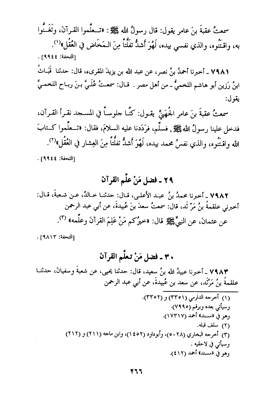 7980 - أَخْبَرَنَا الْقَاسِمُ بْنُ زَكَرِيَّا قَالَ: حَدَّثَنَا زَيْدُ بْنُ حُبَابٍ قَالَ: حَدَّثَنَا مُوسَى بْنُ عَلِيٍّ قَالَ: سَمِعْتُ أَبِي يَقُولُ: سَمِعْتُ عُقْبَةَ بْنَ عَامِرٍ يَقُولُ: قَالَ رَسُولُ اللهِ صَلَّى اللهُ عَلَيْهِ وَسَلَّمَ: «§تَعَلَّمُوا الْقُرْآنَ وَتَغَنُّوا بِهِ وَاقْتَنُوهُ، وَالَّذِي نَفْسِي بِيَدِهِ لَهُوَ أَشَدُّ تَفَلُّتًا مِنَ الْمَخَاضِ فِي الْعَقْلِ»