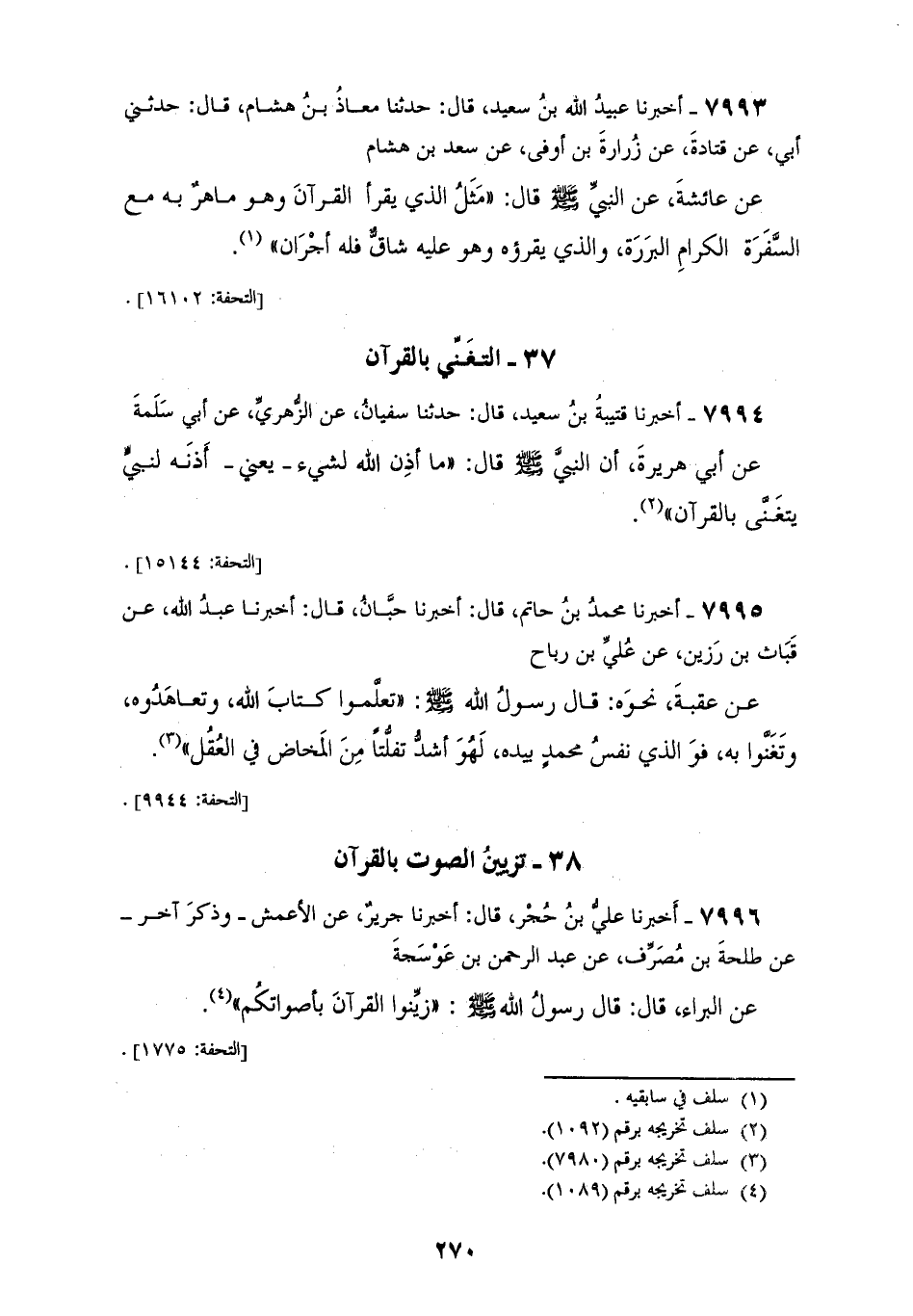 7996 - أَخْبَرَنَا عَلِيُّ بْنُ حُجْرٍ قَالَ: أَخْبَرَنَا جَرِيرٌ، عَنِ الْأَعْمَشِ وَذَكَرَ آخَرُ عَنْ طَلْحَةَ بْنِ مُصَرِّفٍ، عَنْ عَبْدِ الرَّحْمَنِ بْنِ عَوْسَجَةَ، عَنِ الْبَرَاءِ قَالَ: قَالَ رَسُولُ اللهِ صَلَّى اللهُ عَلَيْهِ وَسَلَّمَ: «§زَيِّنُوا الْقُرْآنَ بِأَصْوَاتِكُمْ»
