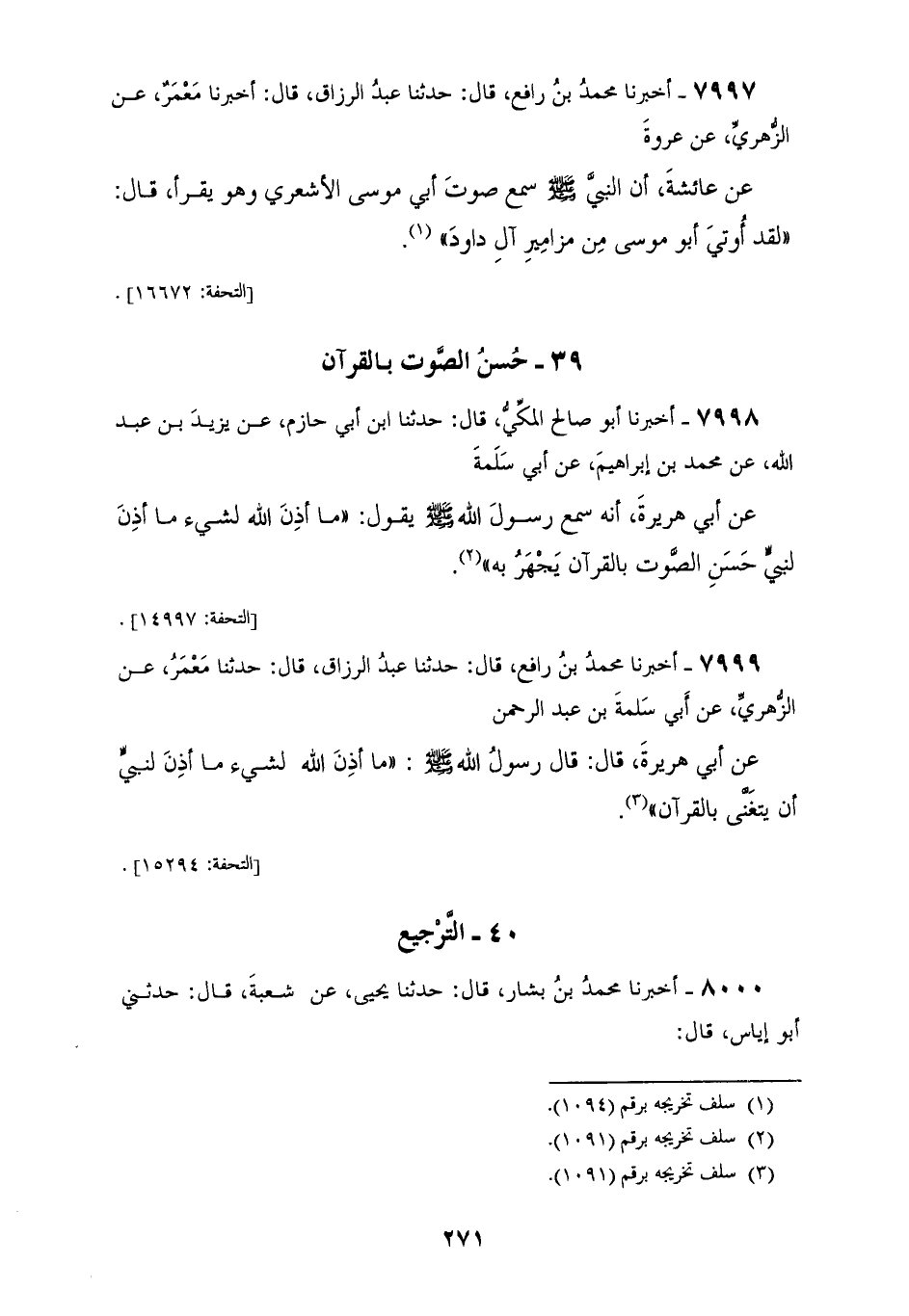 7999 - أَخْبَرَنَا مُحَمَّدُ بْنُ رَافِعٍ قَالَ: حَدَّثَنَا عَبْدُ الرَّزَّاقِ قَالَ: حَدَّثَنَا مَعْمَرٌ، عَنِ الزُّهْرِيِّ، عَنْ أَبِي سَلَمَةَ بْنِ عَبْدِ الرَّحْمَنِ، عَنْ أَبِي هُرَيْرَةَ قَالَ: قَالَ رَسُولُ اللهِ صَلَّى اللهُ عَلَيْهِ وَسَلَّمَ: «§مَا أَذِنَ اللهُ لِشَيْءٍ مَا أَذِنَ لِنَبِيٍّ أَنْ يَتَغَنَّى بِالْقُرْآنِ»