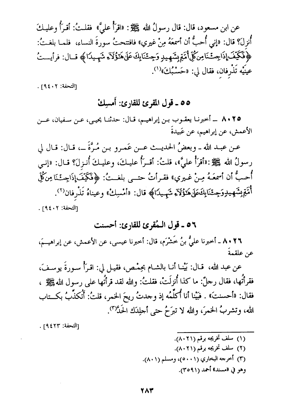8024 - أَخْبَرَنَا سُوَيْدُ بْنُ نَصْرٍ قَالَ: أَخْبَرَنَا عَبْدُ اللهِ، عَنْ سُفْيَانَ، عَنْ سُلَيْمَانَ، عَنْ إِبْرَاهِيمَ، عَنْ عَبِيْدَةَ، عَنِ ابْنِ مَسْعُودٍ قَالَ: قَالَ رَسُولُ اللهِ صَلَّى اللهُ عَلَيْهِ وَسَلَّمَ: «§اقْرَأْ عَلَيَّ» فَقُلْتُ: أَقْرَأُ وَعَلَيْكَ أُنْزِلَ قَالَ: «إِنِّي أُحِبُّ أَنْ أَسْمَعَهُ مِنْ غَيْرِي» فَافْتَتَحْتُ سُورَةَ النِّسَاءِ، فَلَمَّا بَلَّغْتُ {فَكَيْفَ إِذَا جِئْنَا مِنْ كُلِّ أَمَةٍ بِشَهِيدٍ وَجِئْنَا بِكَ عَلَى هَؤُلَاءِ شَهِيدًا} [النساء: 41] قَالَ: فَرَأَيْتُ عَيْنَاهُ تَذْرِفَانِ، فَقَالَ لِي: «حَسْبُكَ»