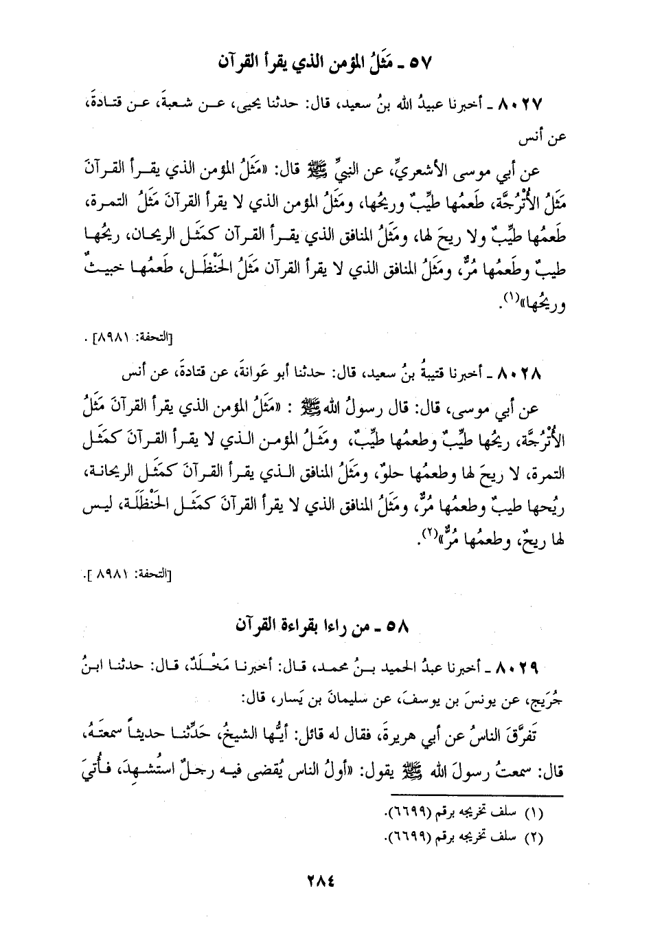 8028 - أَخْبَرَنَا قُتَيْبَةُ بْنُ سَعِيدٍ قَالَ: حَدَّثَنَا أَبُو عَوَانَةَ، عَنْ قَتَادَةَ، عَنْ أَنَسٍ، عَنْ أَبِي مُوسَى قَالَ: قَالَ رَسُولُ اللهِ صَلَّى اللهُ عَلَيْهِ وَسَلَّمَ: «§مَثَلُ الْمُؤْمِنِ الَّذِي يَقْرَأُ الْقُرْآنَ مَثَلُ الْأُتْرُجَّةِ رِيحُهَا طَيِّبٌ وَطَعْمُهَا طَيِّبٌ، وَمَثَلُ الْمُؤْمِنِ الَّذِي لَا يَقْرَأُ الْقُرْآنَ كَمَثَلِ التَّمْرَةِ لَا رِيحَ لَهَا وَطَعْمُهَا حُلْوٌ، وَمَثَلُ الْمُنَافِقِ الَّذِي يَقْرَأُ الْقُرْآنَ كَمَثَلِ الرَّيْحَانَةِ رِيحُهَا طَيِّبٌ وَطَعْمُهَا مُرٌّ، وَمَثَلُ الْمُنَافِقِ الَّذِي لَا يَقْرَأُ الْقُرْآنَ كَمَثَلِ الْحَنْظَلَةِ لَيْسَ لَهَا رِيحٌ وَطَعْمُهَا مُرٌّ»
