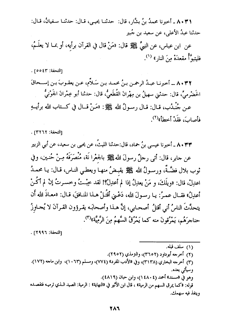 8032 - أَخْبَرَنَا عَبْدُ الرَّحْمَنِ بْنِ مُحَمَّدِ بْنِ سَلَامٍ، عَنْ يَعْقُوبَ بْنِ إِسْحَاقَ الْحَضْرَمِيِّ قَالَ: حَدَّثَنِي سُهَيْلُ بْنُ مِهْرَانَ الْقُطَعِيُّ قَالَ: حَدَّثَنَا أَبُو عِمْرَانَ الْجَوْنِيُّ، عَنْ جُنْدُبٍ قَالَ: قَالَ رَسُولُ اللهِ صَلَّى اللهُ عَلَيْهِ وَسَلَّمَ: «§مَنْ قَالَ فِي كِتَابِ اللهِ بِرَأْيِهِ فَأَصَابَ فَقَدْ أَخْطَأَ»