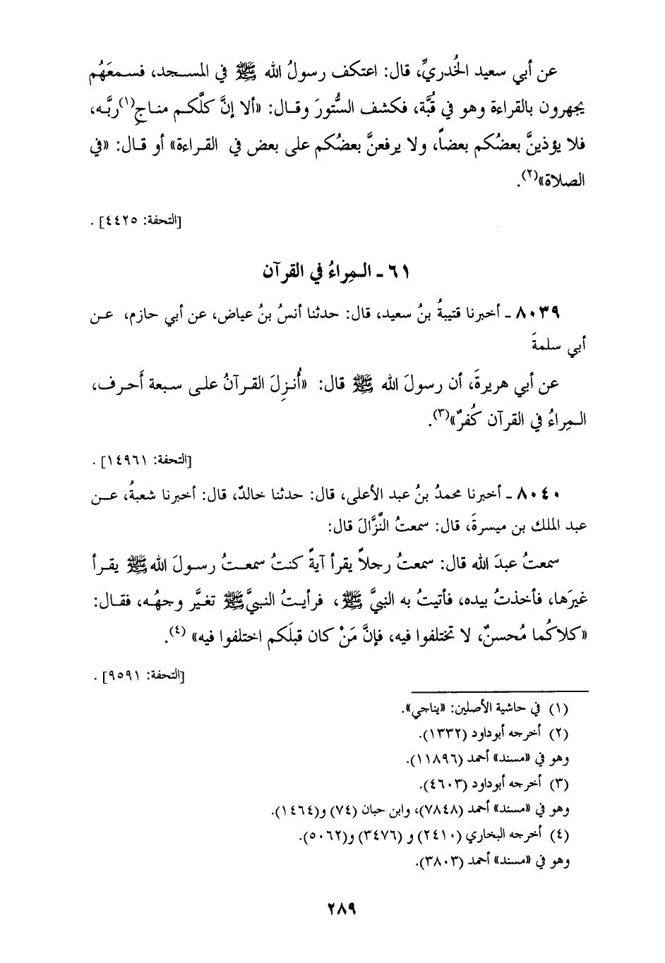 8039 - أَخْبَرَنَا قُتَيْبَةُ بْنُ سَعِيدٍ قَالَ: حَدَّثَنَا أَنَسُ بْنُ عِيَاضٍ، عَنْ أَبِي حَازِمٍ، عَنْ أَبِي سَلَمَةَ، عَنْ أَبِي هُرَيْرَةَ، أَنَّ رَسُولَ اللهِ صَلَّى اللهُ عَلَيْهِ وَسَلَّمَ قَالَ: «§أُنْزِلَ الْقُرْآنُ عَلَى سَبْعَةِ أَحْرُفٍ الْمِرَاءُ فِي الْقُرْآنِ كُفْرٌ»