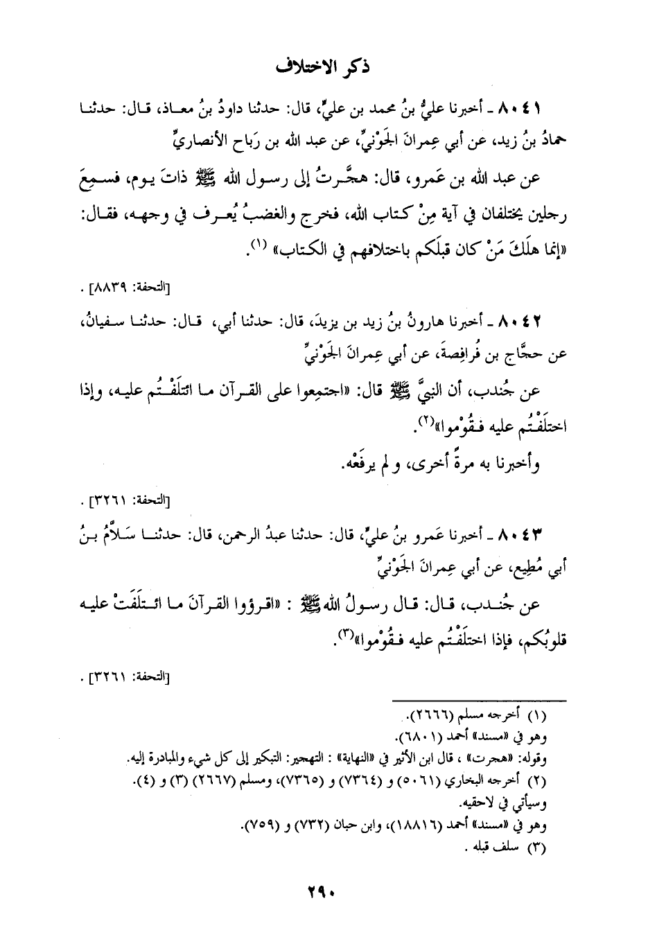 8041 - أَخْبَرَنَا عَلِيُّ بْنُ مُحَمَّدِ بْنِ عَلِيٍّ قَالَ: حَدَّثَنَا دَاوُدُ بْنُ مُعَاذٍ قَالَ: حَدَّثَنَا حَمَّادُ بْنُ زَيْدٍ، عَنْ أَبِي عِمْرَانَ الْجَوْنِيِّ، عَنْ عَبْدِ اللهِ بْنِ رَبَاحٍ الْأَنْصَارِيِّ، عَنْ عَبْدِ اللهِ بْنِ عَمْرٍو قَالَ: §هَجَرْتُ إِلَى رَسُولِ اللهِ صَلَّى اللهُ عَلَيْهِ وَسَلَّمَ ذَاتَ يَوْمٍ فَسَمِعَ رَجُلَيْنِ يَخْتَلِفَانِ فِي آيَةٍ مِنْ كِتَابِ اللهِ، فَخَرَجَ وَالْغَضَبُ يُعْرَفُ فِي وَجْهِهِ فَقَالَ: «إِنَّمَا هَلَكَ مَنْ كَانَ قَبْلَكُمْ بِاخْتِلَافِهِمْ فِي الْكِتَابِ»