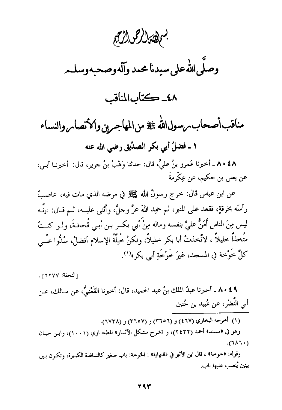 8048 - أَخْبَرَنَا عَمْرُو بْنُ عَلِيٍّ قَالَ: حَدَّثَنَا وَهْبُ بْنُ جَرِيرٍ قَالَ: أَخْبَرَنَا أَبِي، عَنْ يَعْلَى بْنِ حَكِيمٍ، عَنْ عِكْرِمَةَ، عَنِ ابْنِ عَبَّاسٍ قَالَ: §خَرَجَ رَسُولُ اللهِ صَلَّى اللهُ عَلَيْهِ وَسَلَّمَ: فِي مَرَضِهِ الَّذِي مَاتَ فِيهِ عَاصِبٌ رَأْسَهُ بِخِرْقَةٍ، فَقَعَدَ عَلَى الْمِنْبَرِ، ثُمَّ حَمِدَ اللهَ عَزَّ وَجَلَّ وَأَثْنَى عَلَيْهِ ثُمَّ قَالَ: «إِنَّهُ لَيْسَ مِنَ النَّاسِ أَمَنُّ عَلَيَّ بِنَفْسِهِ وَمَالِهِ مِنْ أَبِي بَكْرِ بْنِ أَبِي قُحَافَةَ، وَلَوْ كُنْتُ مُتَّخِذًا خَلِيلًا لَاتَّخَذْتُ أَبَا بَكْرٍ خَلِيلًا، وَلَكِنْ خُلَّةُ الْإِسْلَامِ أَفْضَلُ، سُدُّوا عَنِّي كُلَّ خَوْخَةٍ فِي الْمَسْجِدِ غَيْرَ خَوْخَةِ أَبِي بَكْرٍ»