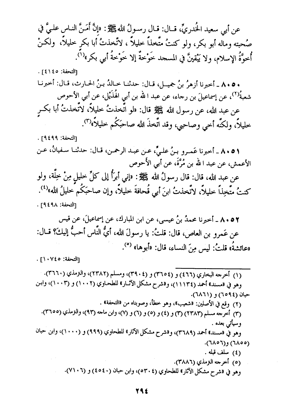 8051 - أَخْبَرَنَا عَمْرُو بْنُ عَلِيٍّ، عَنْ عَبْدِ الرَّحْمَنِ قَالَ: حَدَّثَنَا سُفْيَانُ، عَنِ الْأَعْمَشِ، عَنْ عَبْدِ اللهِ بْنِ مُرَّةَ، عَنْ أَبِي الْأَحْوَصِ، عَنْ عَبْدِ اللهِ قَالَ: قَالَ رَسُولُ اللهِ صَلَّى اللهُ عَلَيْهِ وَسَلَّمَ: «§إِنِّي أَبْرَأُ إِلَى كُلِّ خَلِيلٍ مِنْ خِلَّةٍ، وَلَوْ كُنْتُ مُتَّخِذًا خَلِيلًا لَاتَّخَذْتُ ابْنَ أَبِي قُحَافَةَ خَلِيلًا، وَإِنَّ صَاحِبَكُمْ خَلِيلُ اللهِ»