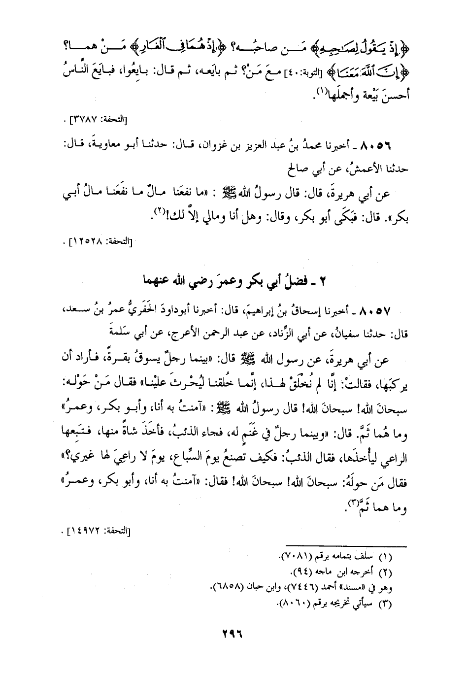 8057 - أَخْبَرَنَا إِسْحَاقُ بْنُ إِبْرَاهِيمَ قَالَ: أَخْبَرَنَا أَبُو دَاوُدَ الْحَفْرِيُّ عُمَرُ بْنُ سَعْدٍ، قَالَ: حَدَّثَنَا سُفْيَانُ، عَنْ أَبِي الزِّنَادِ، عَنْ عَبْدِ الرَّحْمَنِ الْأَعْرَجِ، عَنْ أَبِي سَلَمَةَ، عَنْ أَبِي هُرَيْرَةَ، عَنْ رَسُولِ اللهِ صَلَّى اللهُ عَلَيْهِ وَسَلَّمَ قَالَ: «§بَيْنَمَا رَجُلٌ يَسُوقُ بَقَرَةً، فَأَرَادَ أَنْ يَرْكَبَهَا» فَقَالَتْ: إِنَّا لَمْ نُخْلَقْ لِهَذَا، إِنَّمَا خُلِقْنَا لِيُحْرَثَ عَلَيْنَا فَقَالَ مَنْ حَوْلَهُ: «سُبْحَانَ اللهِ، سُبْحَانَ اللهِ» قَالَ رَسُولُ اللهِ صَلَّى اللهُ عَلَيْهِ وَسَلَّمَ: «آمَنْتُ بِهِ أَنَا وَأَبُو بَكْرٍ وَعُمَرُ وَمَا هُمَا ثَمَّ» قَالَ: «وَبَيْنَمَا رَجُلٌ فِي غَنَمٍ لَهُ، فَجَاءَ الذِّئْبُ فَأَخَذَ شَاةً مِنْهَا، فَتَبِعَهَا الرَّاعِي لِيَأْخُذَهَا» فَقَالَ الذِّئْبُ: فَكَيْفَ تَصْنَعُ يَوْمَ السِّبَاعِ يَوْمَ لَا رَاعِيَ لَهَا غَيْرِي؟ فَقَالَ مَنْ حَوْلَهُ: «سُبْحَانَ اللهِ، سُبْحَانَ اللهِ» فَقَالَ: «آمَنْتُ بِهِ أَنَا وَأَبُو بَكْرٍ وَعُمَرُ، وَمَا هُمَا ثَمَّ»