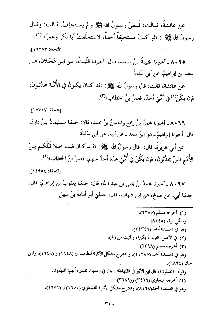 8065 - أَخْبَرَنَا قُتَيْبَةُ بْنُ سَعِيدٍ قَالَ: أَخْبَرَنَا اللَّيْثُ، عَنِ ابْنِ عَجْلَانَ، عَنْ سَعْدِ بْنِ إِبْرَاهِيمَ، عَنْ أَبِي سَلَمَةَ، عَنْ عَائِشَةَ قَالَتْ: قَالَ رَسُولُ اللهِ صَلَّى اللهُ عَلَيْهِ وَسَلَّمَ: «§قَدْ كَانَ يَكُونُ فِي الْأُمَّةِ مُحَدِّثُونَ، فَإِنْ يَكُنْ فِي أُمَّتِي أَحَدٌ فَعُمَرُ بْنُ الْخَطَّابِ»