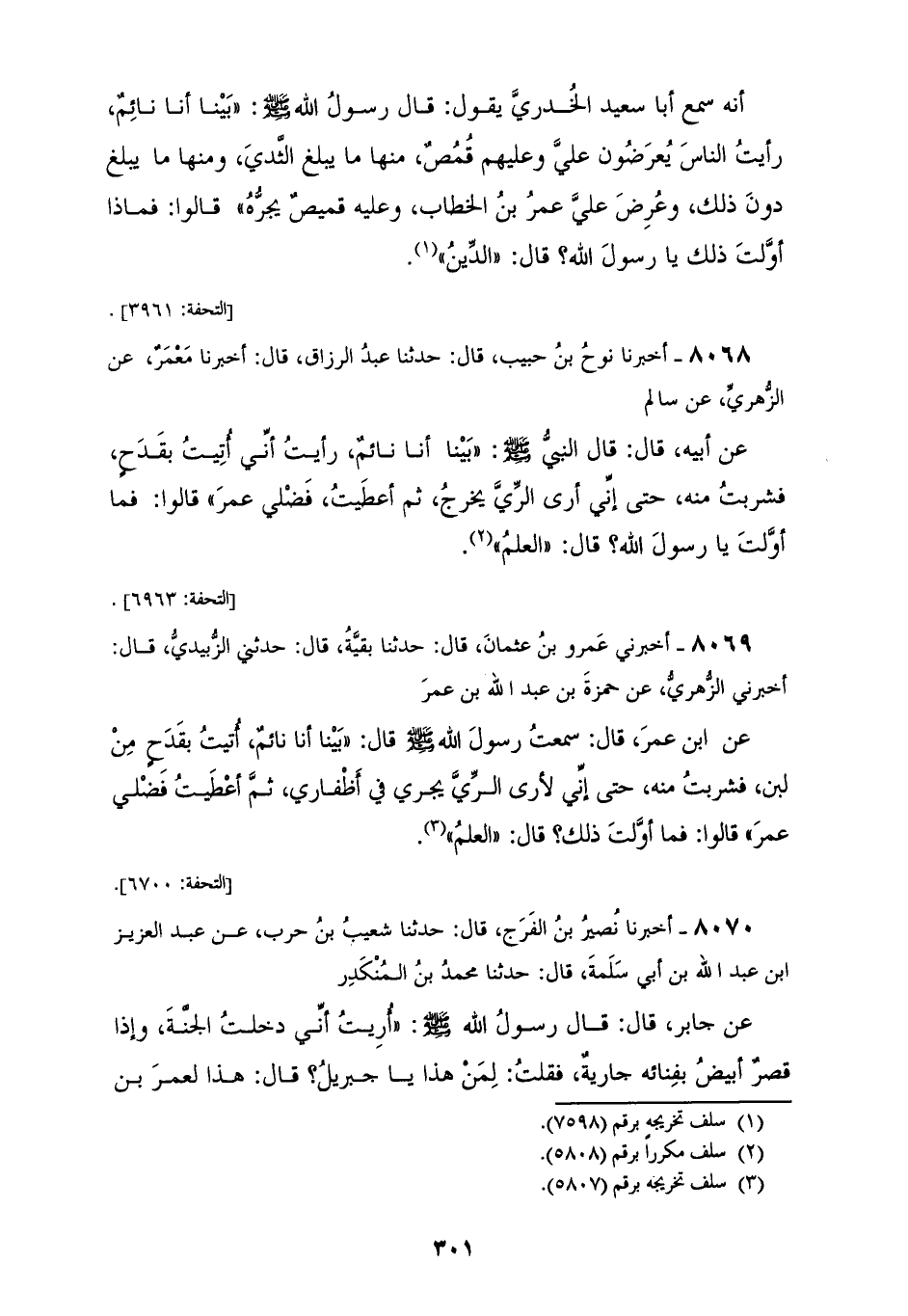 8068 - أَخْبَرَنَا نُوحُ بْنُ حَبِيبٍ قَالَ: حَدَّثَنَا عَبْدُ الرَّزَّاقِ قَالَ: أَخْبَرَنَا مَعْمَرٌ، عَنِ الزُّهْرِيِّ، عَنْ سَالِمٍ، عَنْ أَبِيهِ قَالَ: قَالَ النَّبِيُّ صَلَّى اللهُ عَلَيْهِ وَسَلَّمَ: «§بَيْنَا أَنَا نَائِمٌ رَأَيْتُ أَنِّي أُتِيتُ بِقَدَحٍ فَشَرِبْتُ مِنْهُ حَتَّى إِنِّي أَرَى الرِّيَّ يَخْرُجُ، ثُمَّ أَعْطَيْتُ فَضْلِي عُمَرَ» قَالُوا: فَمَا أَوَّلْتَ يَا رَسُولَ اللهِ؟ قَالَ: «الْعِلْمَ»