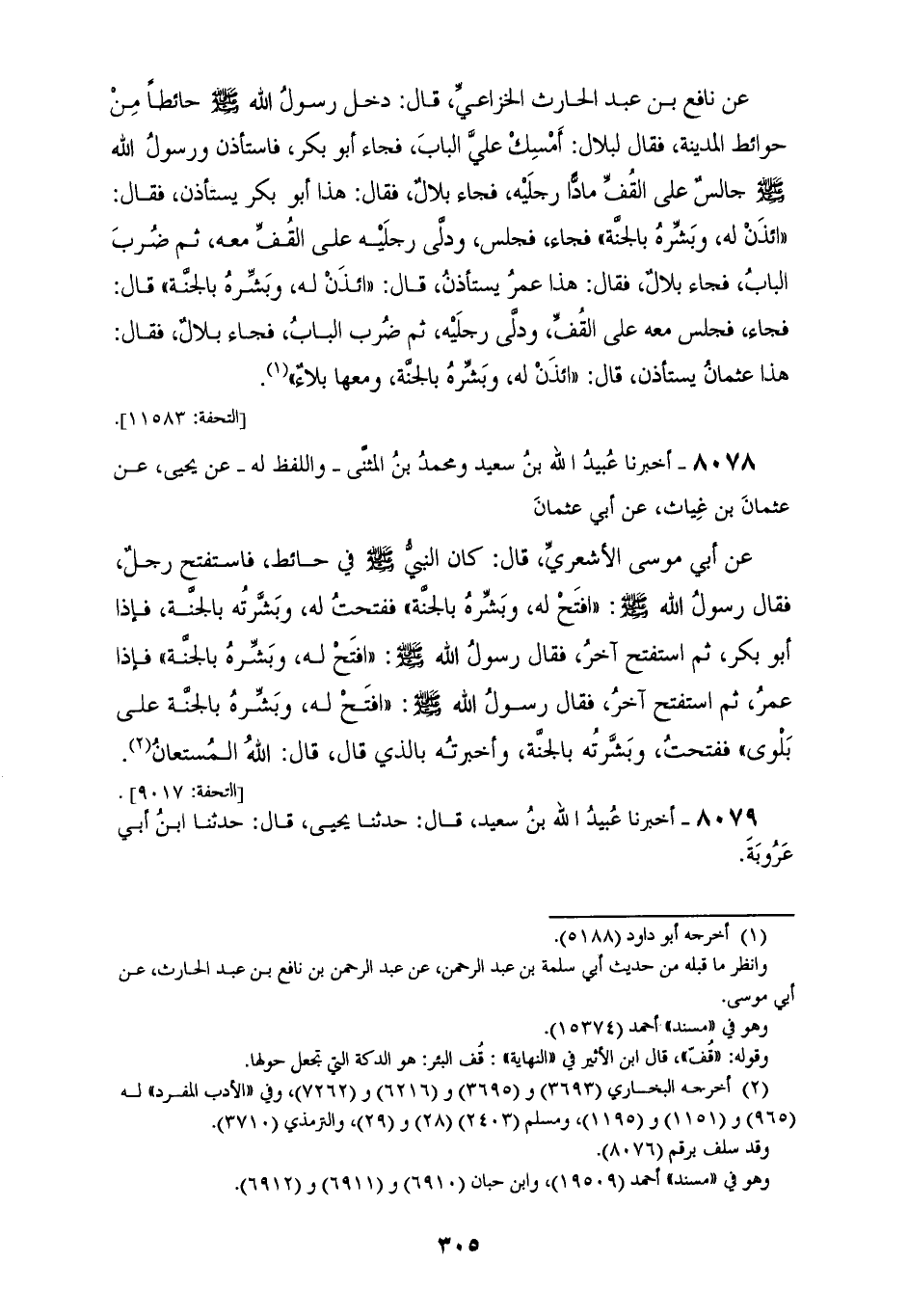 8077 - أَخْبَرَنَا عَلِيُّ بْنُ حُجْرٍ قَالَ: حَدَّثَنَا إِسْمَاعِيلُ، عَنْ مُحَمَّدِ بْنِ عَمْرٍو، عَنْ أَبِي سَلَمَةَ، عَنْ نَافِعِ بْنِ عَبْدِ الْحَارِثِ الْخُزَاعِيِّ قَالَ: §دَخَلَ رَسُولُ اللهِ صَلَّى اللهُ عَلَيْهِ وَسَلَّمَ حَائِطًا مِنْ حَوَائِطِ الْمَدِينَةِ فَقَالَ لِبِلَالٍ: «أَمْسِكْ عَلَيَّ الْبَابَ» فَجَاءَ أَبُو بَكْرٍ فَاسْتَأْذَنَ وَرَسُولُ اللهِ صَلَّى اللهُ عَلَيْهِ وَسَلَّمَ جَالِسٌ عَلَى الْقُفِّ مَادًّا رِجْلَيْهِ، فَجَاءَ بِلَالٌ فَقَالَ: هَذَا أَبُو بَكْرٍ يَسْتَأْذِنُ فَقَالَ: «ائْذَنْ لَهُ وَبَشِّرْهُ بِالْجَنَّةِ» فَجَاءَ فَجَلَسَ وَدَلَّى رِجْلَيْهِ عَلَى الْقُفِّ مَعَهُ ثُمَّ ضَرَبَ الْبَابَ، فَجَاءَ بِلَالٌ فَقَالَ: هَذَا عُمَرُ يَسْتَأْذِنُ قَالَ: «ائْذَنْ لَهُ وَبَشِّرْهُ بِالْجَنَّةِ» قَالَ: فَجَاءَ فَجَلَسَ مَعَهُ عَلَى الْقُفِّ، وَدَلَّى رِجْلَيْهِ، ثُمَّ ضَرَبَ الْبَابَ، فَجَاءَ بِلَالٌ فَقَالَ: هَذَا عُثْمَانُ يَسْتَأْذِنُ قَالَ: «ائْذَنْ لَهُ وَبَشِّرْهُ بِالْجَنَّةِ وَمَعَهَا بَلَاءٌ»