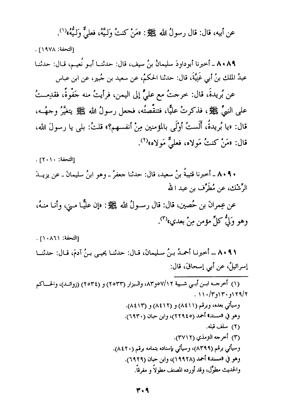8090 - أَخْبَرَنَا قُتَيْبَةُ بْنُ سَعِيدٍ قَالَ: حَدَّثَنَا جَعْفَرٌ، وَهُوَ ابْنُ سُلَيْمَانَ عَنْ يَزِيدَ الرِّشْكِ، عَنْ مُطَرِّفِ بْنِ عَبْدِ اللهِ، عَنْ عِمْرَانَ بْنِ حَصِينٍ قَالَ: قَالَ رَسُولُ اللهِ صَلَّى اللهُ عَلَيْهِ وَسَلَّمَ: «§إِنَّ عَلِيًّا مِنِّي وَأَنَا مِنْهُ، وَهُوَ وَلِيُّ كُلِّ مُؤْمِنٍ مِنْ بَعْدِي»