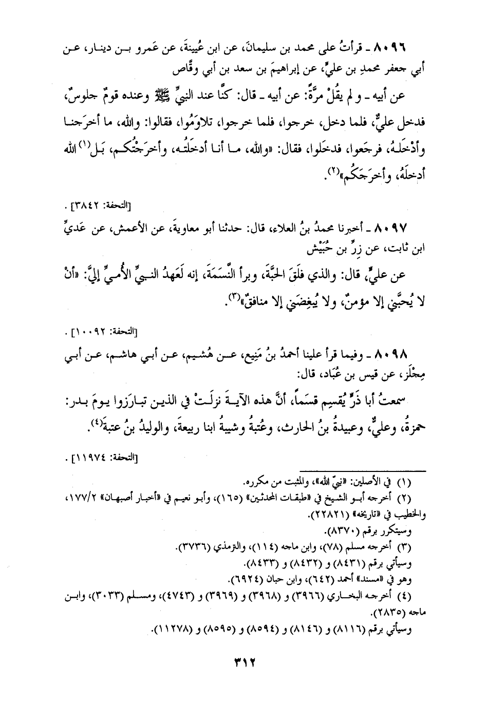 8097 - أَخْبَرَنَا مُحَمَّدُ بْنُ الْعَلَاءِ قَالَ: حَدَّثَنَا أَبُو مُعَاوِيَةَ، عَنِ الْأَعْمَشِ، عَنْ عَدِيِّ بْنِ ثَابِتٍ، عَنْ زِرِّ بْنِ حُبَيْشٍ، عَنْ عَلِيٍّ قَالَ: «§وَالَّذِي فَلَقَ الْحَبَّةَ وَبَرَأَ النَّسَمَةَ إِنَّهُ لَعَهْدُ النَّبِيِّ الْأُمِّيِّ إِلَيَّ، أَنْ لَا يُحِبَّنِي إِلَّا مُؤْمِنٌ، وَلَا يَبْغَضَنِي إِلَّا مُنَافِقٌ»