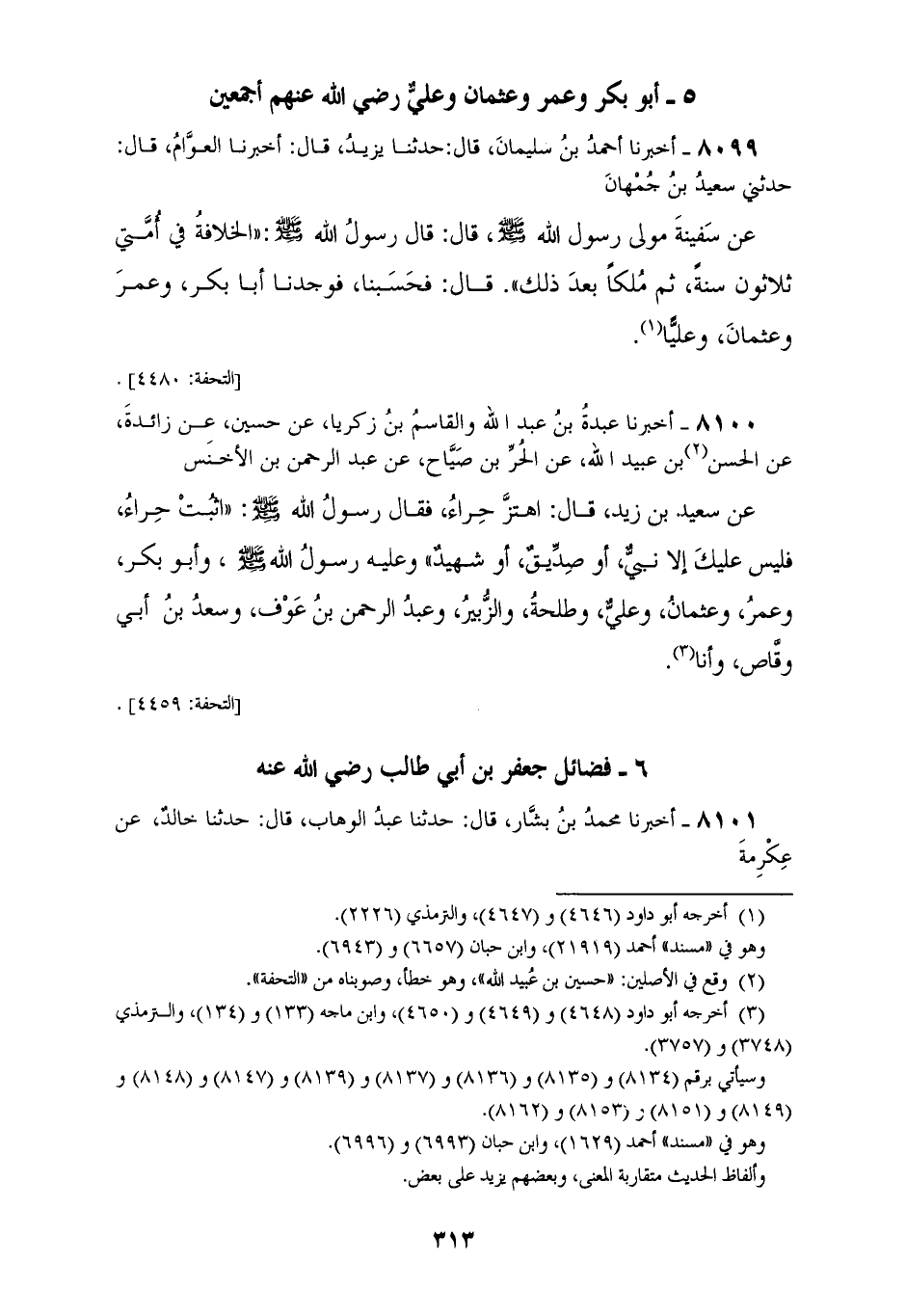 8100 - أَخْبَرَنَا عَبْدَةُ بْنُ عَبْدِ اللهِ، وَالْقَاسِمُ بْنُ زَكَرِيَّا، عَنْ حُسَيْنٍ، عَنْ زَائِدَةَ، عَنْ الحَسَنِ بْنِ عُبَيْدِ اللهِ، عَنِ الْحُرِّ بْنِ صَيَّاحٍ، عَنْ عَبْدِ الرَّحْمَنِ بْنِ الْأَخْنَسِ، عَنْ سَعِيدِ بْنِ زَيْدٍ قَالَ: اهْتَزَّ حِرَاءُ فَقَالَ رَسُولُ اللهِ صَلَّى اللهُ عَلَيْهِ وَسَلَّمَ: «§اثْبُتْ حِرَاءُ، فَلَيْسَ عَلَيْكَ إِلَّا نَبِيٌّ، أَوْ صِدِّيقٌ، أَوْ شَهِيدٌ» وَعَلَيْهِ رَسُولُ اللهِ صَلَّى اللهُ عَلَيْهِ وَسَلَّمَ، وَأَبُو بَكْرٍ، وَعُمَرُ، وَعُثْمَانُ، وَعَلِيٌّ، وَطَلْحَةُ، وَالزُّبَيْرُ، وَعَبْدُ الرَّحْمَنِ بْنُ عَوْفٍ، وَسَعْدُ بْنُ أَبِي وَقَّاصٍ وَأنا