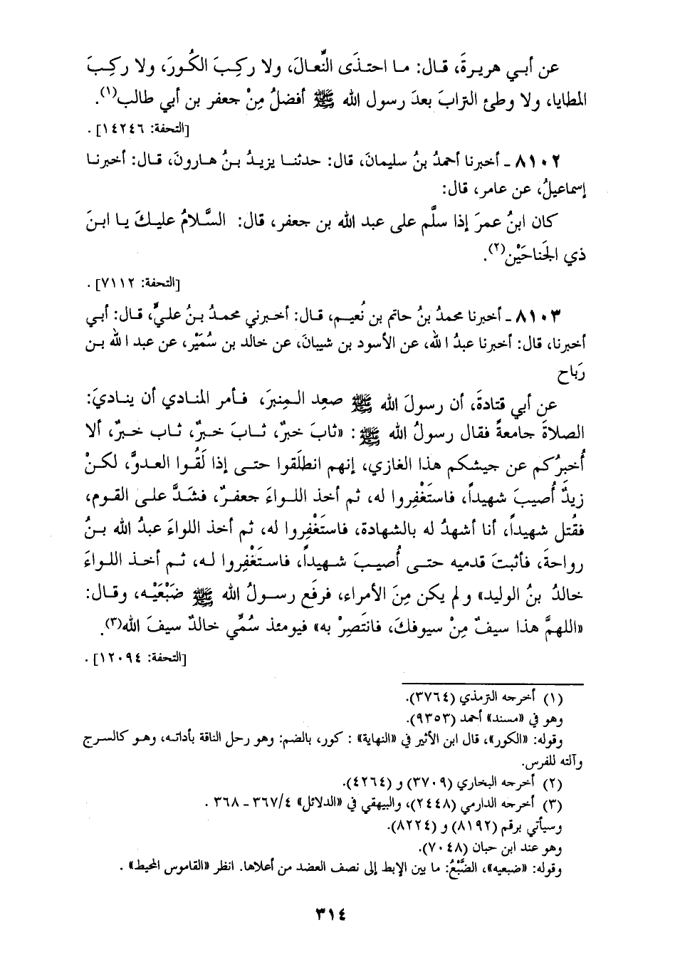 8102 - أَخْبَرَنَا أَحْمَدُ بْنُ سُلَيْمَانَ قَالَ: حَدَّثَنَا يَزِيدُ بْنُ هَارُونَ قَالَ: أَخْبَرَنَا إِسْمَاعِيلُ، عَنْ عَامِرٍ قَالَ: §كَانَ ابْنُ عُمَرَ إِذَا سَلَّمَ عَلَى عَبْدِ اللهِ بْنِ جَعْفَرٍ قَالَ: «السَّلَامُ عَلَيْكَ يَا ابْنَ ذِي الْجَنَاحَيْنِ»