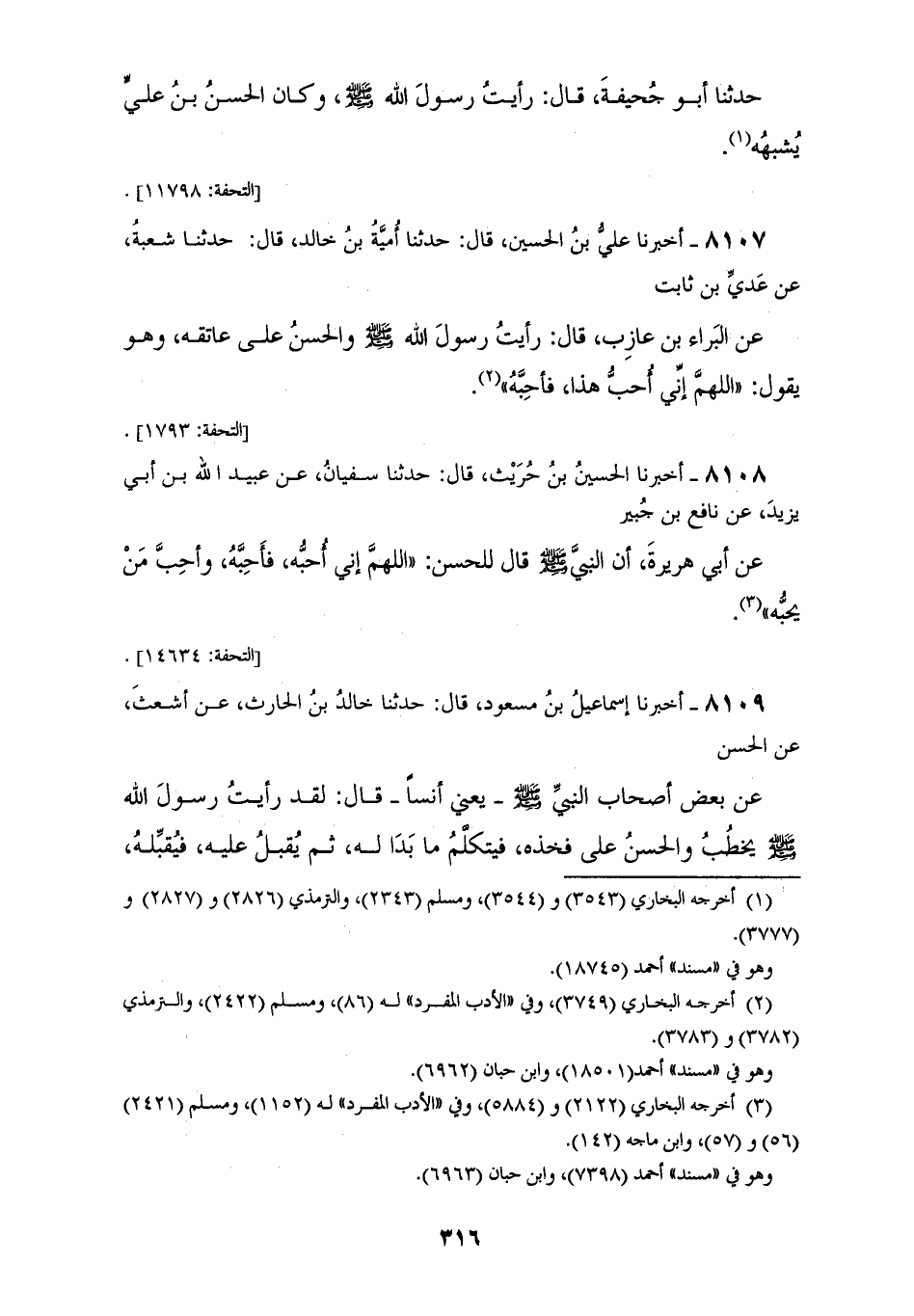 8107 - أَخْبَرَنَا عَلِيُّ بْنُ الْحُسَيْنِ قَالَ: حَدَّثَنَا أُمَيَّةُ بْنُ خَالِدٍ قَالَ: حَدَّثَنَا شُعْبَةُ، عَنْ عَدِيِّ بْنِ ثَابِتٍ، عَنِ الْبَرَاءِ بْنِ عَازِبٍ قَالَ: §رَأَيْتُ رَسُولَ اللهِ صَلَّى اللهُ عَلَيْهِ وَسَلَّمَ وَالْحَسَنُ عَلَى عَاتِقِهِ وَهُوَ يَقُولُ: «اللهُمَّ إِنِّي أُحِبُّ هَذَا فَأَحِبَّهُ»