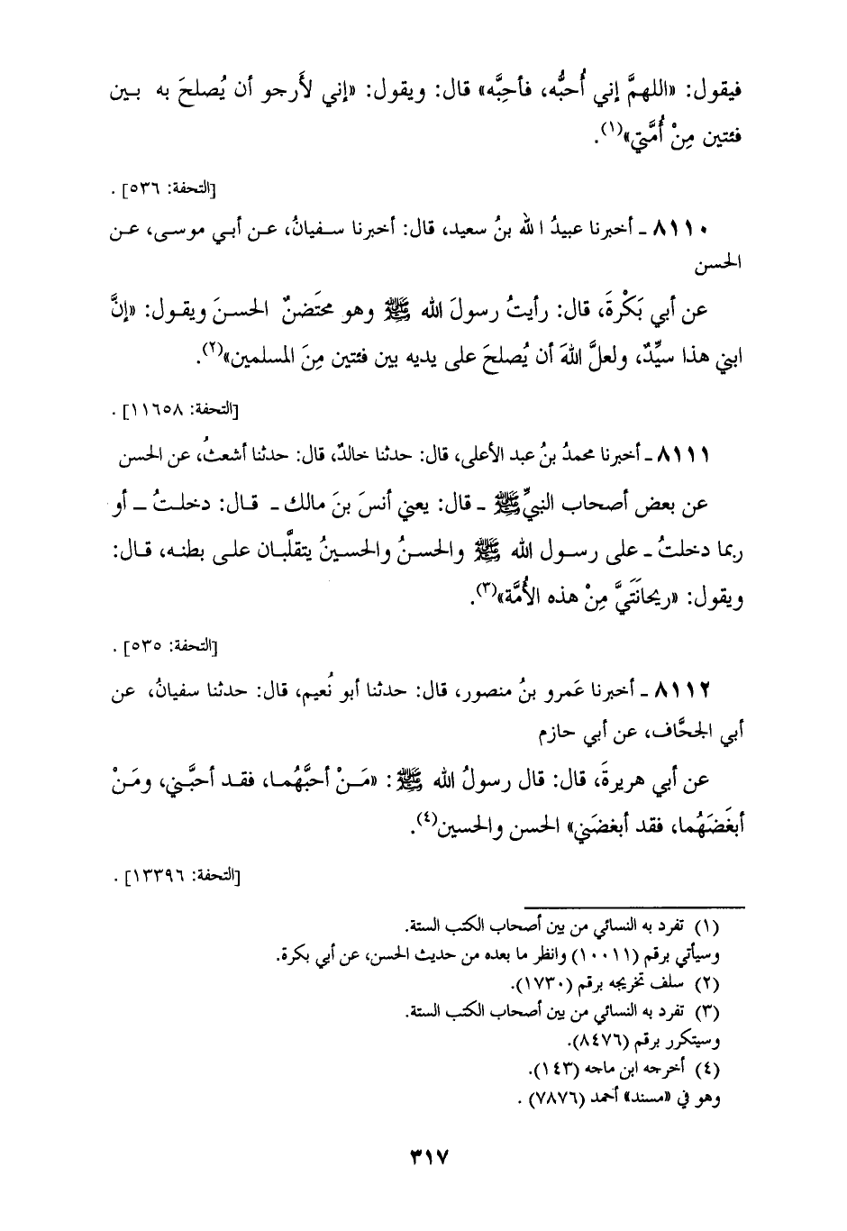 8110 - أَخْبَرَنَا عُبَيْدُ اللهِ بْنُ سَعِيدٍ قَالَ: أَخْبَرَنَا سُفْيَانُ، عَنْ أَبِي مُوسَى، عَنِ الْحَسَنِ، عَنْ أَبِي بَكْرَةَ قَالَ: §رَأَيْتُ رَسُولَ اللهِ صَلَّى اللهُ عَلَيْهِ وَسَلَّمَ وَهُوَ مُحْتَضِنٌ الْحَسَنَ وَيَقُولُ: «إِنَّ ابْنِي هَذَا سَيِّدٌ وَلَعَلَّ اللهَ أَنْ يُصْلِحَ عَلَى يَدَيْهِ بَيْنَ فِئَتَيْنِ مِنَ الْمُسْلِمِينَ»