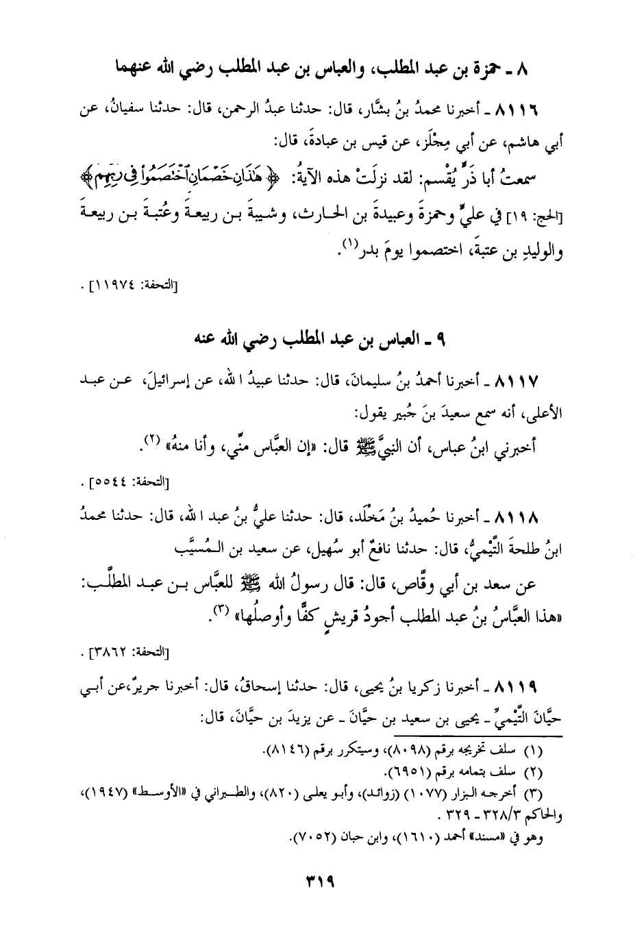 8117 - أَخْبَرَنَا أَحْمَدُ بْنُ سُلَيْمَانَ قَالَ: حَدَّثَنَا عُبَيْدُ اللهِ، عَنْ إِسْرَائِيلَ، عَنْ عَبْدِ الْأَعْلَى، أَنَّهُ سَمِعَ سَعِيدَ بْنَ جُبَيْرٍ، يَقُولُ: أَخْبَرَنِي ابْنُ عَبَّاسٍ، أَنَّ النَّبِيَّ صَلَّى اللهُ عَلَيْهِ وَسَلَّمَ قَالَ: «§إِنَّ الْعَبَّاسَ مِنِّي، وَأَنَا مِنْهُ»