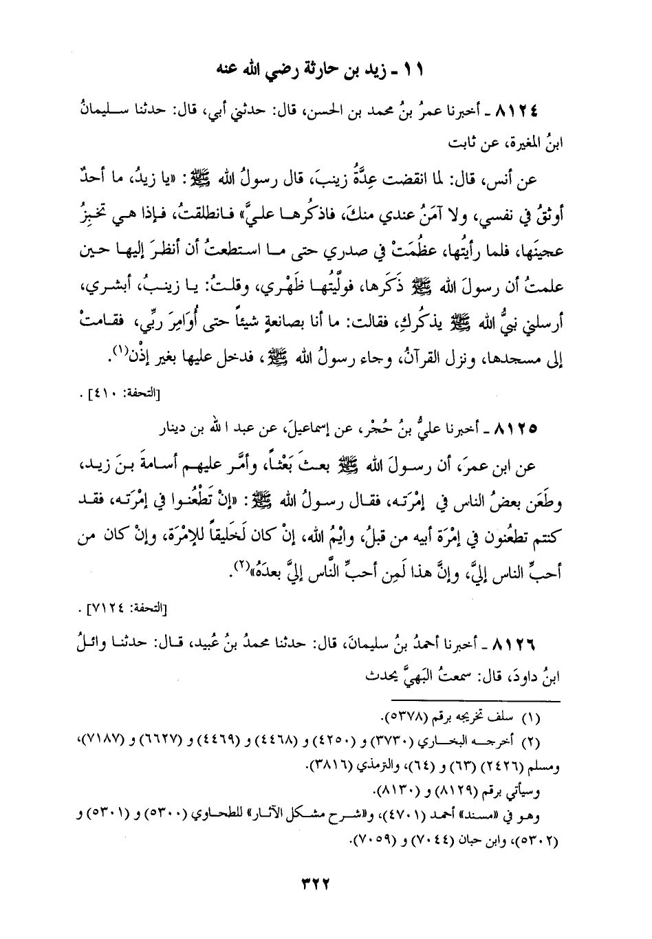 8124 - أَخْبَرَنَا عُمَرُ بْنُ مُحَمَّدِ بْنِ الْحَسَنِ قَالَ: حَدَّثَنِي أَبِي قَالَ: حَدَّثَنَا سُلَيْمَانُ بْنُ الْمُغِيرَةِ، عَنْ ثَابِتٍ، عَنْ أَنَسٍ قَالَ: لَمَّا انْقَضَتْ عِدَّةُ زَيْنَبَ قَالَ رَسُولُ اللهِ صَلَّى اللهُ عَلَيْهِ وَسَلَّمَ: §يَا زَيْدُ «مَا أَحَدٌ أَوْثَقُ فِي نَفْسِي، وَلَا آمَنُ عِنْدِي مِنْكَ، فَاذْكُرْهَا عَلَيَّ» فَانْطَلَقْتُ، فَإِذَا هِيَ تَخْبِزُ عَجِينَهَا، فَلَمَّا رَأَيْتُهَا عَظُمَتْ فِي صَدْرِي حَتَّى مَا اسْتَطَعْتُ أَنْ أَنْظُرَ إِلَيْهَا حِينَ عَلِمْتُ أَنَّ رَسُولَ اللهِ صَلَّى اللهُ عَلَيْهِ وَسَلَّمَ ذَكَرَهَا، فَوَلَّيْتُهَا ظَهْرِي، وَقُلْتُ: يَا زَيْنَبُ، أَبْشِرِي أَرْسَلَنِي نَبِيُّ اللهِ صَلَّى اللهُ عَلَيْهِ وَسَلَّمَ يَذْكُرُكِ، فَقَالَتْ: «مَا أَنَا بِصَانِعَةٍ شَيْئًا حَتَّى أُوَامِرَ رَبِّي، فَقَامَتْ إِلَى مَسْجِدِهَا، وَنَزَلَ الْقُرْآنُ وَجَاءَ رَسُولُ اللهِ صَلَّى اللهُ عَلَيْهِ وَسَلَّمَ فَدَخَلَ عَلَيْهَا بِغَيْرِ إِذْنٍ»