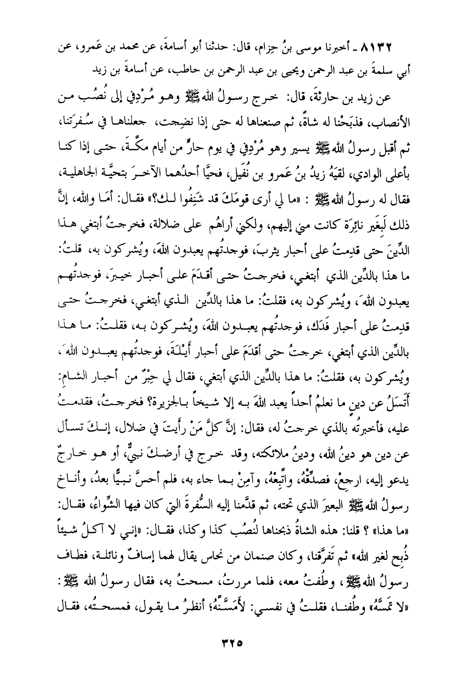 8132 - أَخْبَرَنَا مُوسَى بْنُ حِزَامٍ قَالَ: حَدَّثَنَا أَبُو أُسَامَةَ، عَنْ مُحَمَّدِ بْنِ عَمْرٍو، عَنْ أَبِي سَلَمَةَ بْنِ عَبْدِ الرَّحْمَنِ، وَيَحْيَى بْنِ عَبْدِ الرَّحْمَنِ بْنِ حَاطِبٍ، عَنْ أُسَامَةَ بْنِ زَيْدٍ، عَنْ زَيْدِ بْنِ حَارِثَةَ قَالَ: خَرَجَ رَسُولُ اللهِ صَلَّى اللهُ عَلَيْهِ وَسَلَّمَ: " §وَهُوَ مُرْدِفِي إِلَى نُصُبٍ مِنَ الْأَنْصَابِ فَذَبَحْنَا لَهُ شَاةً، ثُمَّ صَنَعْنَاهَا لَهُ حَتَّى إِذَا نَضِجَتْ جَعَلْنَاهَا فِي سُفْرَتِنَا، ثُمَّ أَقْبَلَ رَسُولُ اللهِ صَلَّى اللهُ عَلَيْهِ وَسَلَّمَ يَسِيرُ وَهُوَ مُرْدِفِي فِي يَوْمٍ حَارٍّ مِنْ أَيَّامِ مَكَّةَ حَتَّى إِذَا كُنَّا بِأَعْلَى الْوَادِي لَقِيَهُ زَيْدُ بْنُ عَمْرِو بْنِ نُفَيْلٍ، فَحَيَّا أَحَدُهُمَا الْآخَرَ بِتَحِيَّةِ الْجَاهِلِيَّةِ فَقَالَ لَهُ رَسُولُ اللهِ صَلَّى اللهُ عَلَيْهِ وَسَلَّمَ: «مَا لِي أَرَى قَوْمَكَ قَدْ شَنِفُوا لَكَ» فَقَالَ: أَمَّا وَاللهِ إِنَّ ذَلِكَ لَبِغَيْرِ نَائِرَةٍ كَانَتْ مِنِّي إِلَيْهِمْ، وَلَكِنِّي أَرَاهُمْ عَلَى ضَلَالَةٍ، فَخَرَجْتُ أَبْتَغِي هَذَا الدِّينَ حَتَّى قَدِمْتُ عَلَى أَحْبَارِ يَثْرِبَ فَوَجَدْتُهُمْ يَعْبُدُونَ اللهَ، وَيُشْرِكُونَ بِهِ قُلْتُ: «مَا هَذَا بِالدَّيْنِ الَّذِي أَبْتَغِي، فَخَرَجْتُ حَتَّى أَقْدَمَ عَلَى أَحْبَارِ خَيْبَرَ فَوَجَدْتُهُمْ يَعْبُدُونَ اللهَ وَيُشْرِكُونَ بِهِ» فَقُلْتُ: مَا هَذَا بِالدَّيْنِ الَّذِي أَبْتَغِي، فَخَرَجْتُ حَتَّى قَدِمْتُ عَلَى أَحْبَارِ فَدَكٍ فَوَجَدْتُهُمْ يَعْبُدُونَ اللهَ وَيُشْرِكُونَ بِهِ فَقُلْتُ: «مَا هَذَا بِالدَّيْنِ الَّذِي أَبْتَغِي، خَرَجْتُ حَتَّى أَقْدَمَ عَلَى أَحْبَارِ أَيْلَةَ فَوَجَدْتُهُمْ يَعْبُدُونَ اللهَ وَيُشْرِكُونَ بِهِ» فَقُلْتُ: مَا هَذَا بِالدَّيْنِ الَّذِي أَبْتَغِي، فَقَالَ لِي حَبْرٌ مِنْ أَحْبَارِ الشَّامِ: «أَتَسْأَلَ عَنْ دِينٍ مَا نَعْلَمُ أَحَدًا يَعْبَدُ اللهَ بِهِ إِلَّا شَيْخًا بِالْجَزِيرَةِ؟ فَخَرَجْتُ فَقَدِمْتُ عَلَيْهِ فَأَخْبَرْتُهُ بِالَّذِي خَرَجْتُ لَهُ» فَقَالَ: إِنَّ كُلَّ مَنْ رَأَيْتَ فِي ضَلَالٍ إِنَّكَ تَسْأَلُ عَنْ دِينٍ هُوَ دِينُ اللهِ وَدِينُ مَلَائِكَتِهِ، وَقَدْ خَرَجَ فِي أَرْضِكَ نَبِيٌّ أَوْ هُوَ خَارِجٌ يَدْعُو إِلَيْهِ، ارْجِعْ فَصَدِّقْهُ وَاتَّبِعْهُ وَآمِنْ بِمَا جَاءَ بِهِ، فَلَمْ أُحِسَّ نَبِيًّا بَعْدُ، وَأَنَاخَ رَسُولُ اللهِ صَلَّى اللهُ عَلَيْهِ وَسَلَّمَ الْبَعِيرَ الَّذِي تَحْتَهُ، ثُمَّ قَدَّمْنَا إِلَيْهِ السُّفْرَةَ الَّتِي كَانَ فِيهَا الشِّوَاءُ فَقَالَ: «مَا هَذَا؟» قُلْنَا: هَذِهِ الشَّاةُ ذَبَحْنَاهَا لِنَصْبِ كَذَا وَكَذَا، فَقَالَ: إِنِّي لَا آكِلُ شَيْئًا ذُبِحَ لِغَيْرِ اللهِ، ثُمَّ تَفَرَّقْنَا، وَكَانَ صَنَمَانِ مِنْ نُحَاسٍ يُقَالُ لَهُمَا إِسَافُ وَنَائِلَةُ، فَطَافَ رَسُولُ اللهِ صَلَّى اللهُ عَلَيْهِ وَسَلَّمَ وَطُفْتُ مَعَهُ، فَلَمَّا مَرَرْتُ مَسَحْتُ بِهِ فَقَالَ رَسُولُ اللهِ صَلَّى اللهُ عَلَيْهِ وَسَلَّمَ: «لَا تَمَسَّهُ» وَطُفْنَا فَقُلْتُ فِي نَفْسِي: لَأَمَسَّنَّهُ أَنْظُرُ مَا يَقُولُ: فَمَسَحْتُهُ فَقَالَ رَسُولُ اللهِ صَلَّى اللهُ عَلَيْهِ وَسَلَّمَ: «لَا تَمَسَّهُ أَلَمْ تُنْهَ» قَالَ: فَوَالَّذِي أَكْرَمَهُ وَأَنْزَلَ عَلَيْهِ الْكِتَابَ مَا اسْتَلَمَ صَنَمًا حَتَّى أَكْرَمَهُ بِالَّذِي أَكْرَمَهُ، وَأَنْزَلَ عَلَيْهِ الْكِتَابَ قَالَ: وَمَاتَ زَيْدُ بْنُ عَمْرِو بْنِ نُفَيْلٍ قَبْلَ أَنْ يُبْعَثَ النَّبِيُّ صَلَّى اللهُ عَلَيْهِ وَسَلَّمَ فَقَالَ رَسُولُ اللهِ صَلَّى اللهُ عَلَيْهِ وَسَلَّمَ: «يَأْتِي يَوْمَ الْقِيَامَةِ أُمَّةً وَحْدَهُ»
