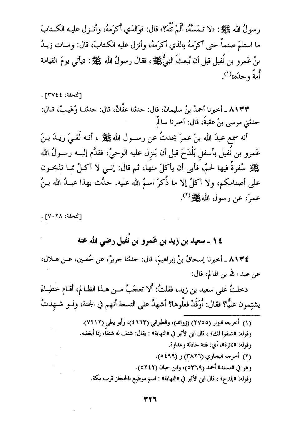 8133 - أَخْبَرَنَا أَحْمَدُ بْنُ سُلَيْمَانَ قَالَ: حَدَّثَنَا عَفَّانُ قَالَ: حَدَّثَنَا وُهَيْبٌ قَالَ: حَدَّثَنِي مُوسَى بْنُ عُقْبَةَ قَالَ: أَخْبَرَنَا سَالِمٌ، أَنَّهُ سَمِعَ عَبْدَ اللهِ بْنَ عُمَرَ، يُحَدِّثُ عَنْ رَسُولِ اللهِ صَلَّى اللهُ عَلَيْهِ وَسَلَّمَ: §أَنَّهُ لَقِيَ زَيْدَ بْنَ عَمْرِو بْنِ نُفَيْلٍ بِأَسْفَلِ بَلْدَحَ قَبْلَ أَنْ يَنْزِلَ عَلَيْهِ الْوَحْيُ، فَقَدَّمَ إِلَيْهِ رَسُولُ اللهِ صَلَّى اللهُ عَلَيْهِ وَسَلَّمَ سُفْرَةً فِيهَا لَحْمٌ، فَأَبَى أَنْ يَأْكُلَ مِنْهَا، ثُمَّ قَالَ: «إِنِّي لَا آكِلُ مِمَّا تَذْبَحُونَ عَلَى أَصْنَامِكُمْ، وَلَا آكُلُ إِلَّا مَا ذُكِرَ اسْمُ اللهِ عَلَيْهِ»، حَدَّثَ بِهَذَا عَبْدُ اللهِ بْنُ عُمَرَ عَنْ رَسُولِ اللهِ صَلَّى اللهُ عَلَيْهِ وَسَلَّمَ