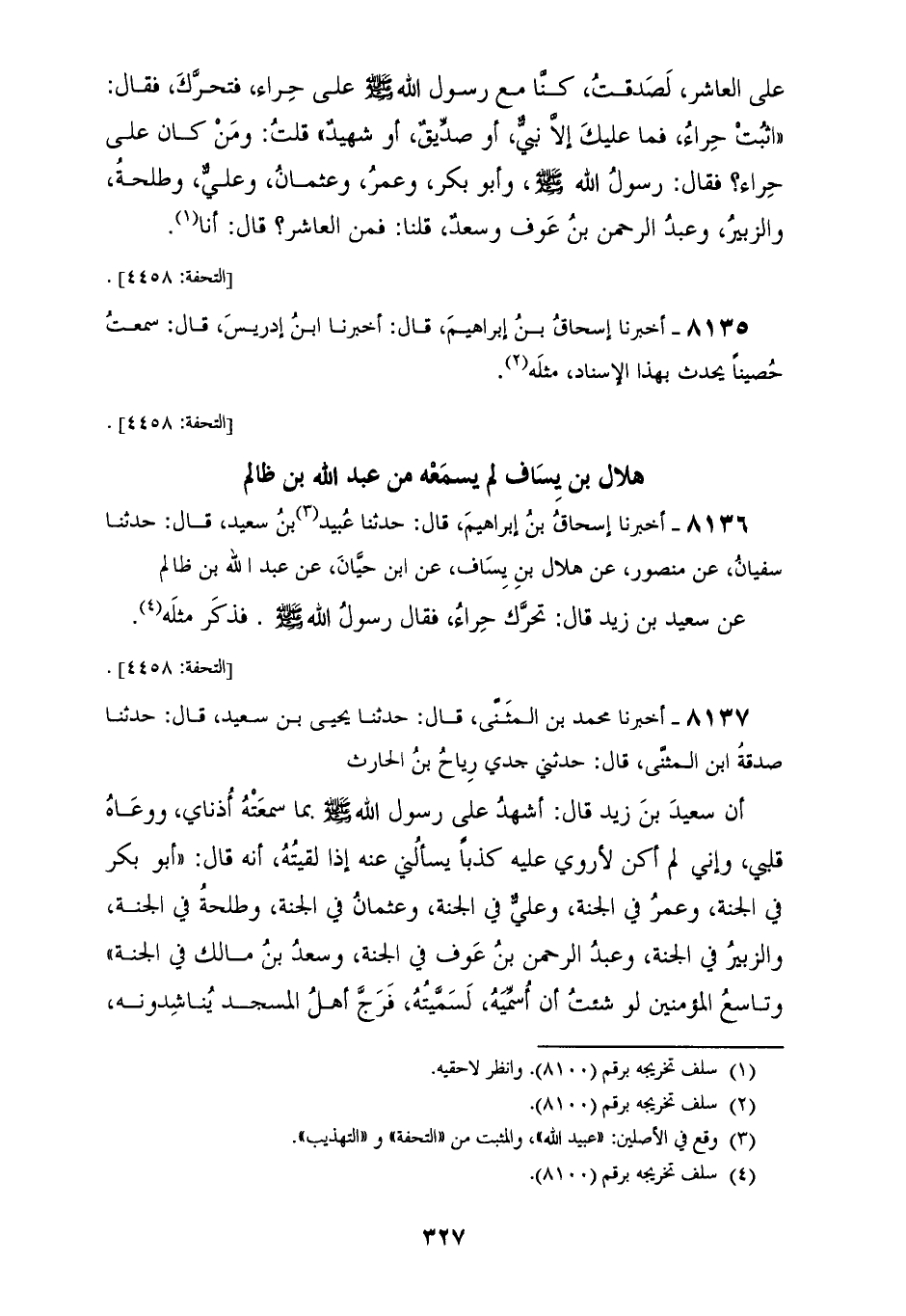 8137 - أَخْبَرَنَا مُحَمَّدُ بْنُ الْمُثَنَّى قَالَ: حَدَّثَنَا يَحْيَى بْنُ سَعِيدٍ قَالَ: حَدَّثَنَا صَدَقَةُ بْنُ الْمُثَنَّى قَالَ: حَدَّثَنِي جَدِّي رَبَاحُ بْنُ الْحَارِثِ أَنَّ سَعِيدَ بْنَ زَيْدٍ قَالَ: " أَشْهَدُ عَلَى رَسُولِ اللهِ صَلَّى اللهُ عَلَيْهِ وَسَلَّمَ بِمَا سَمِعَتْهُ أُذُنَايَ وَوَعَاهُ قَلْبِي، وَإِنِّي لَمْ أَكُنْ لِأَرْوِيَ عَلَيْهِ كَذِبًا يَسْأَلُنِي عَنْهُ إِذَا لَقِيتُهُ أَنَّهُ قَالَ: «§أَبُو بَكْرٍ فِي الْجَنَّةِ، وَعُمَرُ فِي الْجَنَّةِ، وَعَلِيٌّ فِي الْجَنَّةِ، وَعُثْمَانُ فِي الْجَنَّةِ، وَطَلْحَةُ فِي الْجَنَّةِ وَالزُّبَيْرُ فِي الْجَنَّةِ، وَعَبْدُ الرَّحْمَنِ بْنُ عَوْفٍ فِي الْجَنَّةِ، وَسَعْدُ بْنُ مَالِكٍ فِي الْجَنَّةِ» وَتَاسِعُ الْمُؤْمِنِينَ لَوْ شِئْتُ أَنْ أُسَمِّيَهُ لَسَمَّيْتُهُ فَرَجَّ أَهْلُ الْمَسْجِدِ يُنَاشِدُونَهُ يَا صَاحِبَ رَسُولِ اللهِ، صَلَّى اللهُ عَلَيْهِ وَسَلَّمَ مَنِ التَّاسِعُ؟ قَالَ: «نَاشَدْتُمُونِي بِاللهِ الْعَظِيمِ، أَنَا تَاسِعُ الْمُؤْمِنِينَ وَرَسُولُ اللهِ صَلَّى اللهُ عَلَيْهِ وَسَلَّمَ الْعَاشِرُ»