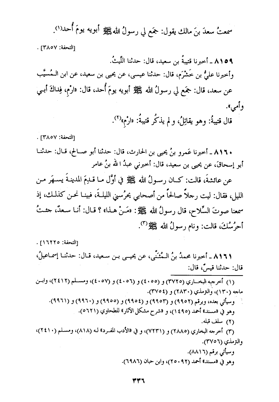 8159 - أَخْبَرَنَا قُتَيْبَةُ بْنُ سَعِيدٍ قَالَ: حَدَّثَنَا اللَّيْثُ، وَأَخْبَرَنَا عَلِيُّ بْنُ خَشْرَمٍ قَالَ: حَدَّثَنَا عِيسَى، عَنْ يَحْيَى بْنِ سَعِيدٍ، عَنِ ابْنِ الْمُسَيِّبِ، عَنْ سَعْدٍ قَالَ: §جَمَعَ لِي رَسُولُ اللهِ صَلَّى اللهُ عَلَيْهِ وَسَلَّمَ أَبَوَيْهِ يَوْمَ أُحُدٍ قَالَ: «ارْمِ فِدَاكَ أَبِي وَأُمِّي» قَالَ قُتَيْبَةُ: «وَهُوَ يُقَاتِلُ، وَلَمْ يَذْكُرْ قُتَيْبَةُ ارْمِ»