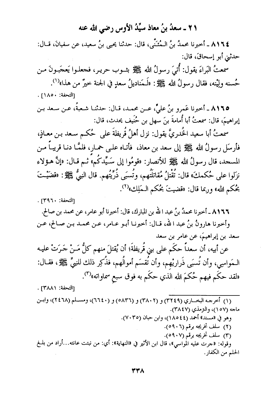 8165 - أَخْبَرَنَا عَمْرُو بْنُ عَلِيٍّ، عَنْ مُحَمَّدٍ قَالَ: حَدَّثَنَا شُعْبَةُ، عَنْ سَعْدِ بْنِ إِبْرَاهِيمَ قَالَ: سَمِعْتُ أَبَا أُمَامَةَ بْنَ سَهْلِ بْنِ حُنَيْفٍ، يُحَدِّثُ قَالَ: سَمِعْتُ أَبَا سَعِيدٍ الْخُدْرِيَّ يَقُولُ: " §نَزَلَ أَهْلُ قُرَيْظَةَ عَلَى حَكَمِ سَعْدِ بْنِ مُعَاذٍ فَأَرْسَلَ رَسُولُ اللهِ صَلَّى اللهُ عَلَيْهِ وَسَلَّمَ إِلَى سَعْدِ بْنِ مُعَاذٍ فَأَتَاهُ عَلَى حِمَارٍ فَلَمَّا دَنَا قَرِيبًا مِنَ الْمَسْجِدِ قَالَ رَسُولُ اللهِ صَلَّى اللهُ عَلَيْهِ وَسَلَّمَ لِلْأَنْصَارِ: «قُومُوا إِلَى سَيِّدِكُمْ» ثُمَّ قَالَ: «إِنَّ هَؤُلَاءِ نَزَلُوا عَلَى حُكْمِكَ» قَالَ: «تُقَتَّلُ مُقَاتِلَتُهُمْ، وَتُسْبَى ذُرِّيَّتُهُمْ» قَالَ النَّبِيُّ صَلَّى اللهُ عَلَيْهِ وَسَلَّمَ: «قَضَيْتَ بِحُكْمِ اللهِ» وَرُبَّمَا قَالَ: «قَضَيْتَ بِحُكْمِ الْمَلِكِ»